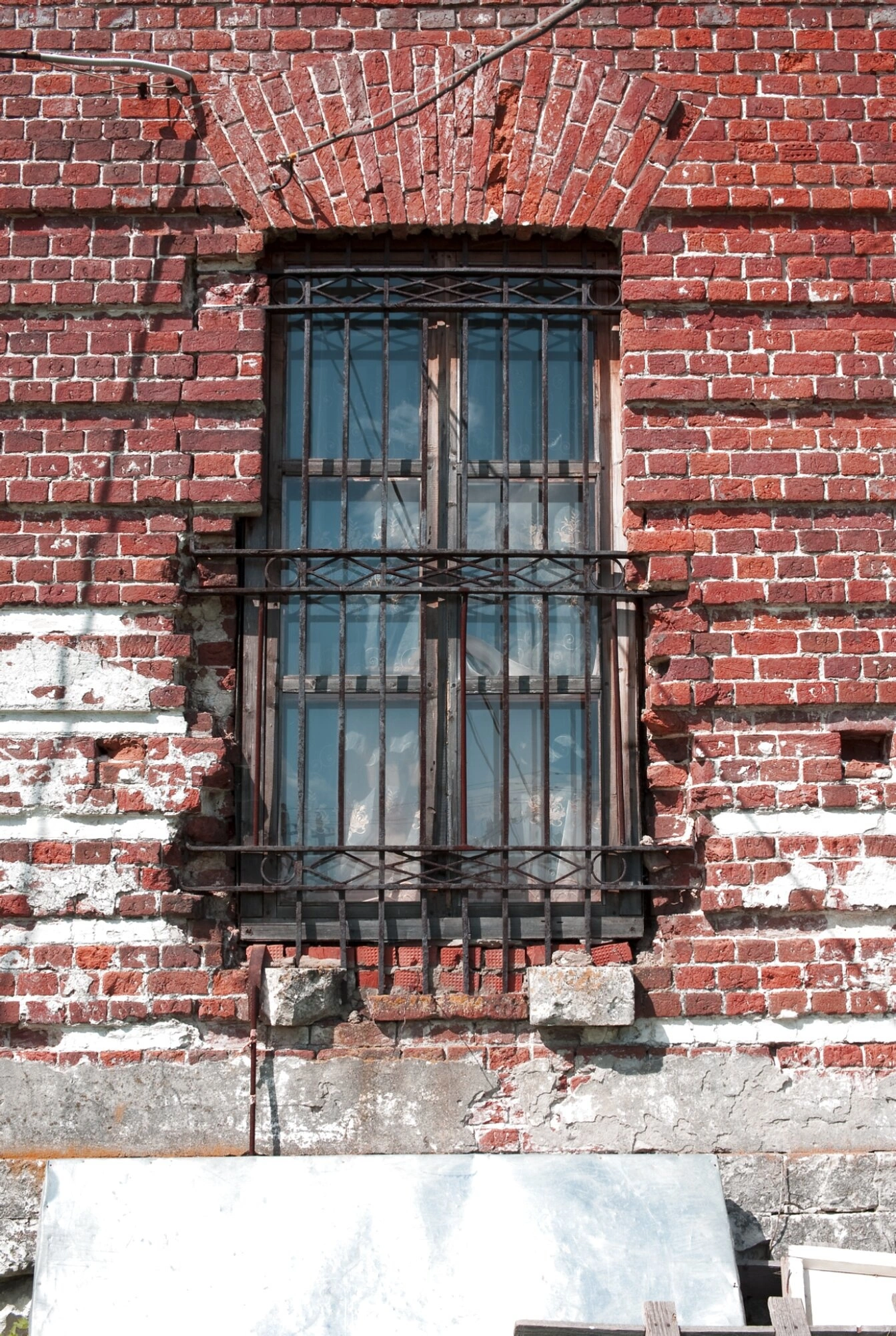 Центральным элементом снимка является оконный проём, перекрытый разгрузочной кирпичной аркой — традиционным архитектурным приёмом в церковном зодчестве, предназначенным для равномерного распределения нагрузки и придания конструкции особой прочности. Окошко, служившее для освещения внутреннего пространства храма и вентиляции, защищено ажурной кованой решёткой, выполненной с применением художественной ковки и имеющей декоративные элементы. Подобные решётки не только выполняли утилитарную защитную функцию, но и символизировали ограждение духовного мира от мира суетного.