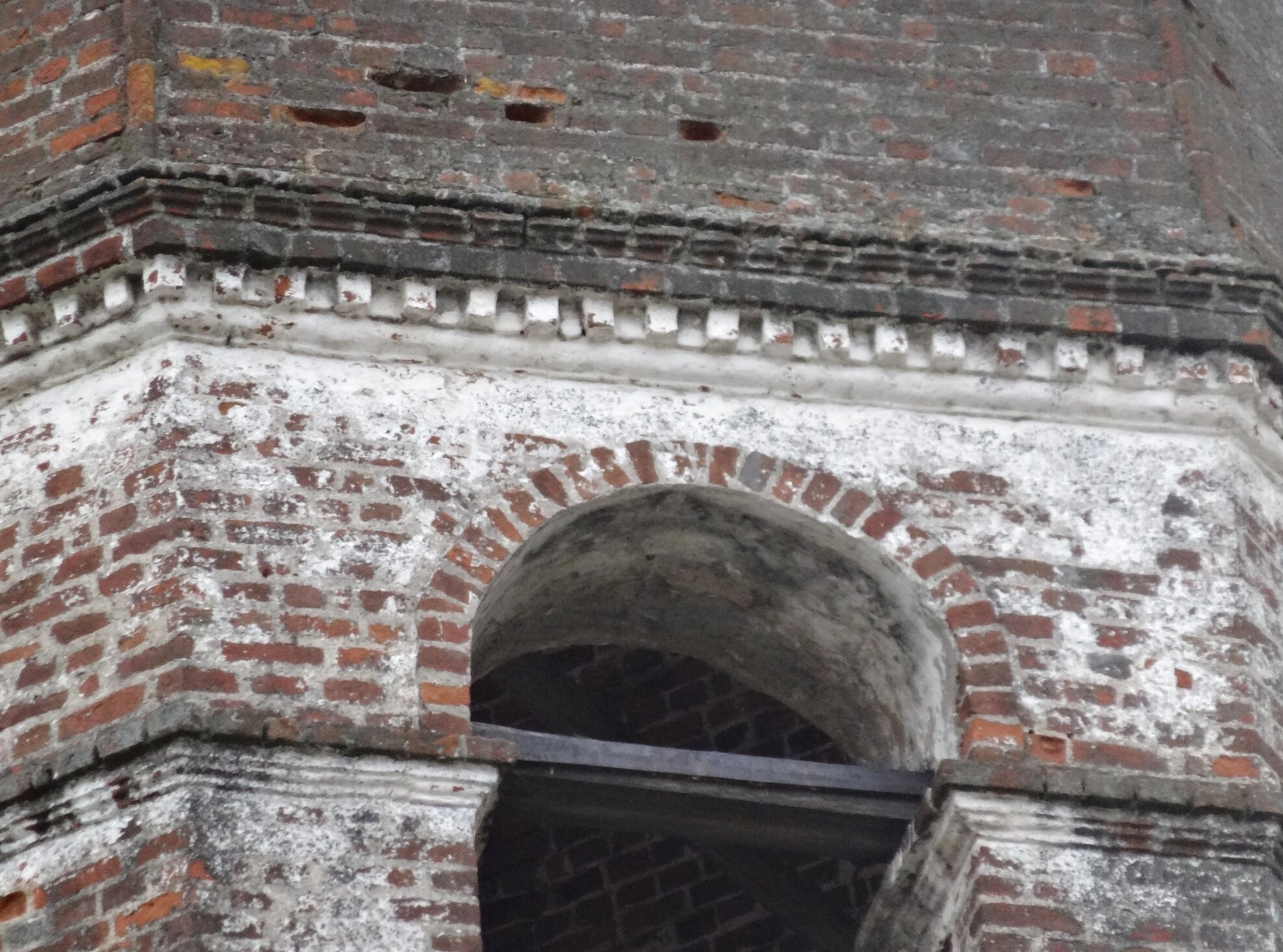 В центре композиции находится арочное окно, характерный элемент церковной архитектуры XIX столетия. Окно лишено остекления, что позволяет взгляду устремиться внутрь пространства храма, вызывая чувство сопричастности к его истории и духовной жизни. Выше оконного проёма проходит выразительный декоративный карниз, украшенный рядом так называемых «сухариков» – прямоугольных зубчатых элементов, которые являются традиционным украшением русских церквей и придают архитектурному облику строения особую ритмичность и завершённость.