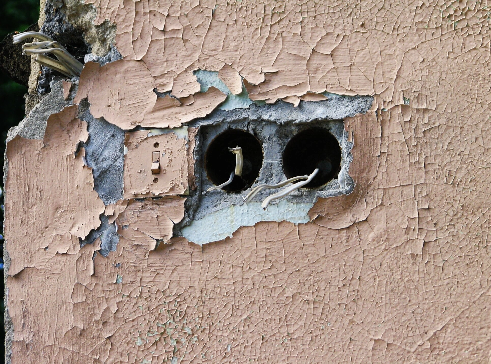 На представленной фотографии запечатлён фрагмент стенной поверхности в помещении храма Святителя Николая Чудотворца, что располагается на историческом погосте Ровки. Изображение демонстрирует участок стены с многослойным покрытием, где верхний бежевый слой краски значительно облупился, потрескался и частично отслоился, обнажая нижележащий серый слой штукатурки или бетонное основание. Подобное состояние свидетельствует о почтенном возрасте строения и необходимости проведения реставрационно-восстановительных работ.
