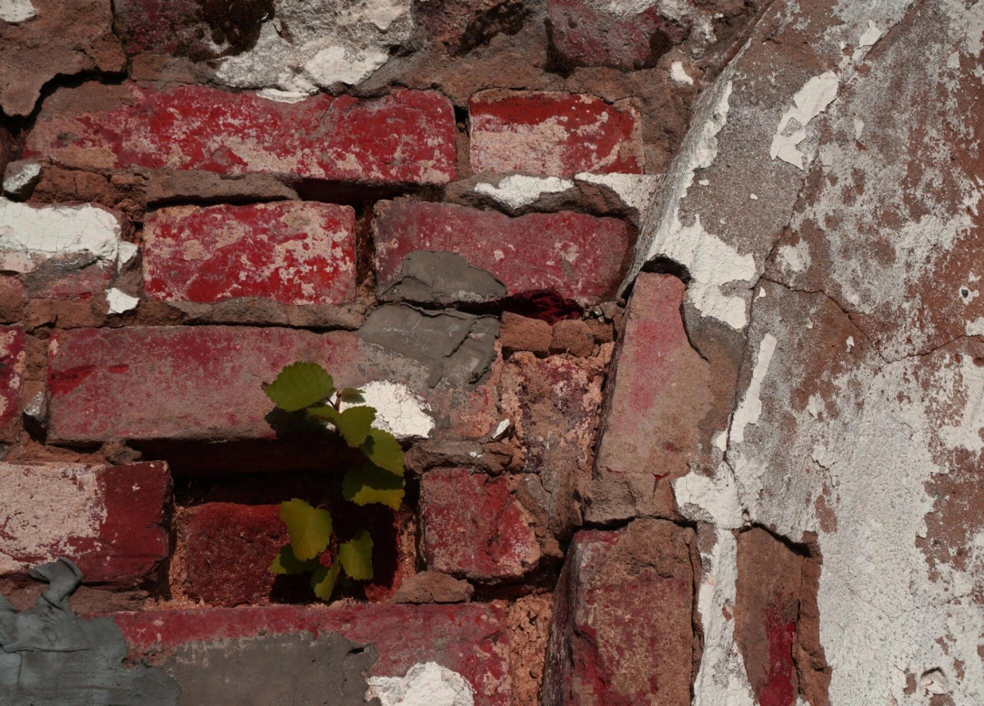 Состояние кирпичной кладки и связующего раствора свидетельствует о многолетнем воздействии природных стихий. Поверхность имеет многочисленные повреждения: глубокие трещины, сколы, выветренные участки и следы эрозии. Особого внимания заслуживает живой зеленый росток, пробивающийся из щели между кирпичами, что символизирует надежду на возрождение и вечность жизни даже среди разрушения.