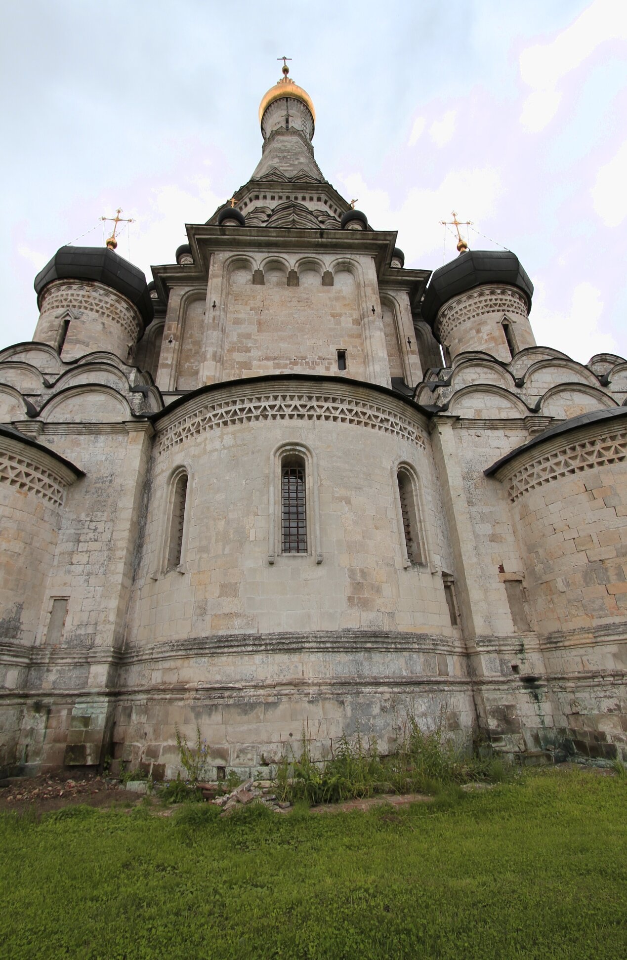На представленном изображении запечатлён фрагмент внешней стены древнего храма — Церкви Преображения Господня, что расположена в селе Остров Ленинского городского округа Московской области. Снимок демонстрирует уникальную кладку из белого камня — местного известняка, добыча которого велась в каменоломнях Подмосковья и который является характерным материалом для храмового зодчества данной земли.