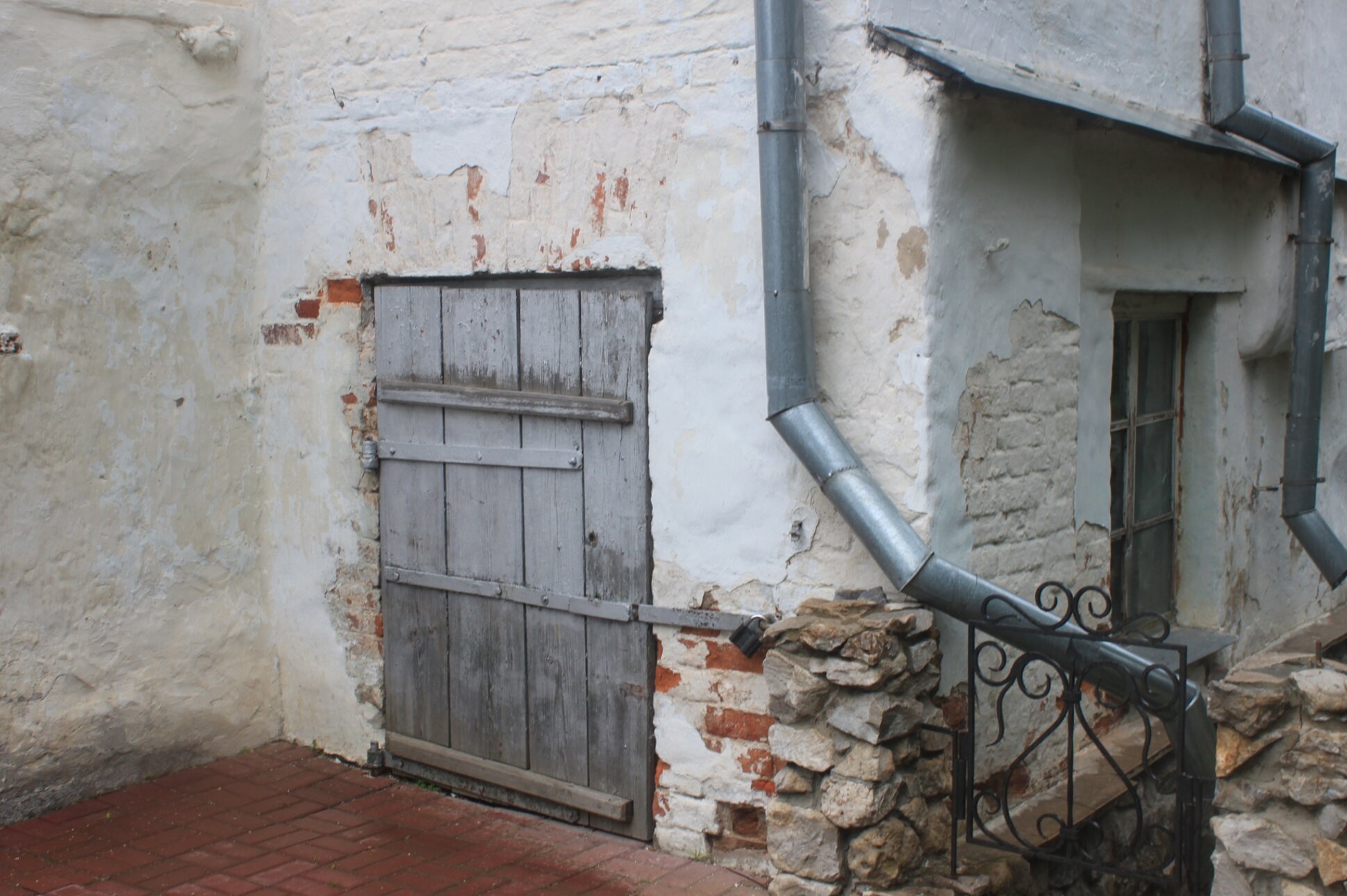 На фотографии запечатлен фрагмент стены Спасо-Преображенского храма, расположенного в селе Спас-Загорье Калужской области. Стена, сложенная из красного кирпича, частично сохранила старую штукатурку, что придает ей особый, благоговейный вид, свидетельствующий о долгой истории святого места. В центре композиции находится простая, но величественная деревянная дверь, собранная из массивных горизонтальных досок и укрепленная кованым засовом. Эта дверь ведет в намоленное пространство храма, где многие поколения верующих обретали утешение и совершали молитвы.