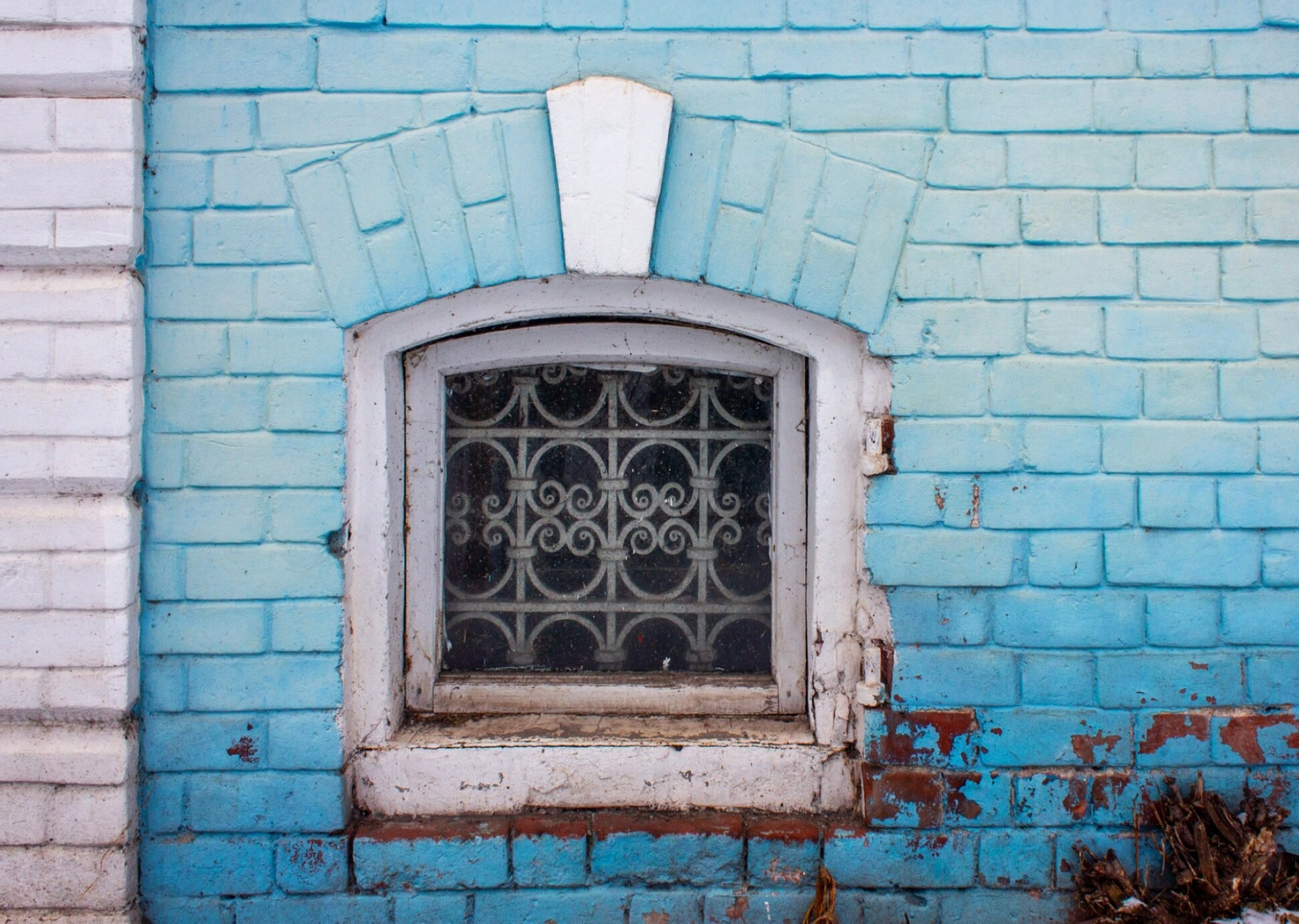 Центральным элементом композиции является небольшое арочное окно, характерное для церковной архитектуры. Белая оконная рама имеет следы времени и многолетней эксплуатации. В проёме окна установлена кованая металлическая решётка с изящным узорчатым орнаментом, состоящим из повторяющихся завитков, что обеспечивало как безопасность, так и декоративную функцию.