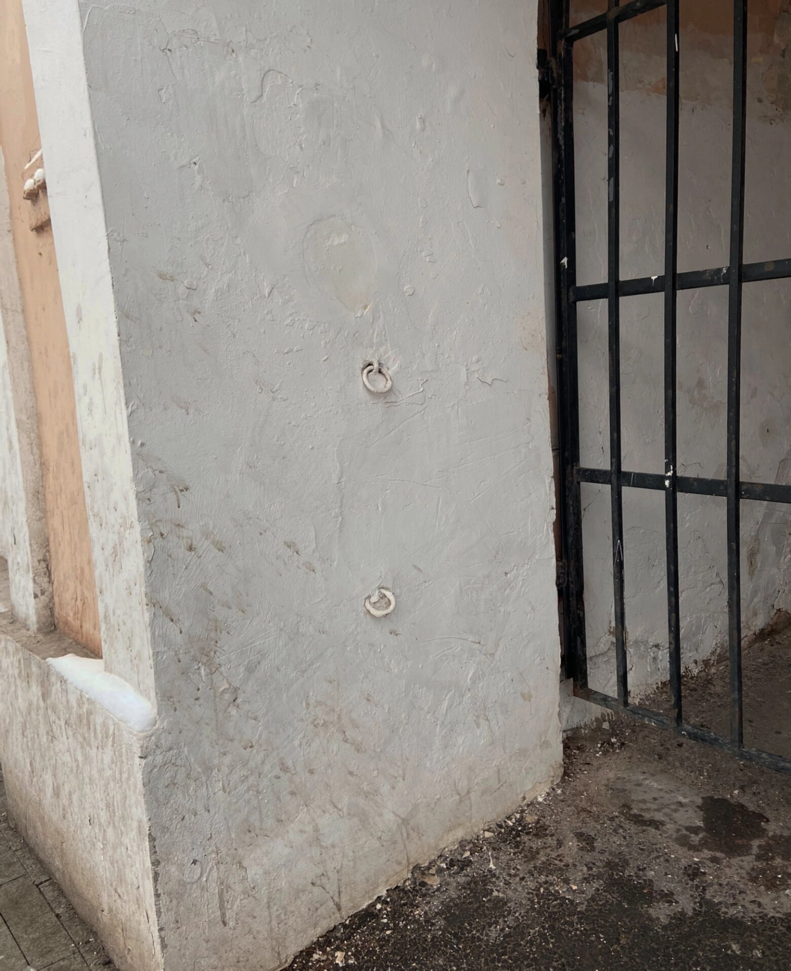 На изображении чётко просматриваются два металлических кольца, вмонтированных в каменную кладку стены. Эти элементы, вероятно, выполняли утилитарное назначение в хозяйственной жизни храма — возможно, использовались для крепления светильников, хоругвей или иной церковной утвари. Поверхность стены демонстрирует характерную для храмовых построек штукатурную отделку, выполненную в традициях православного зодчества.