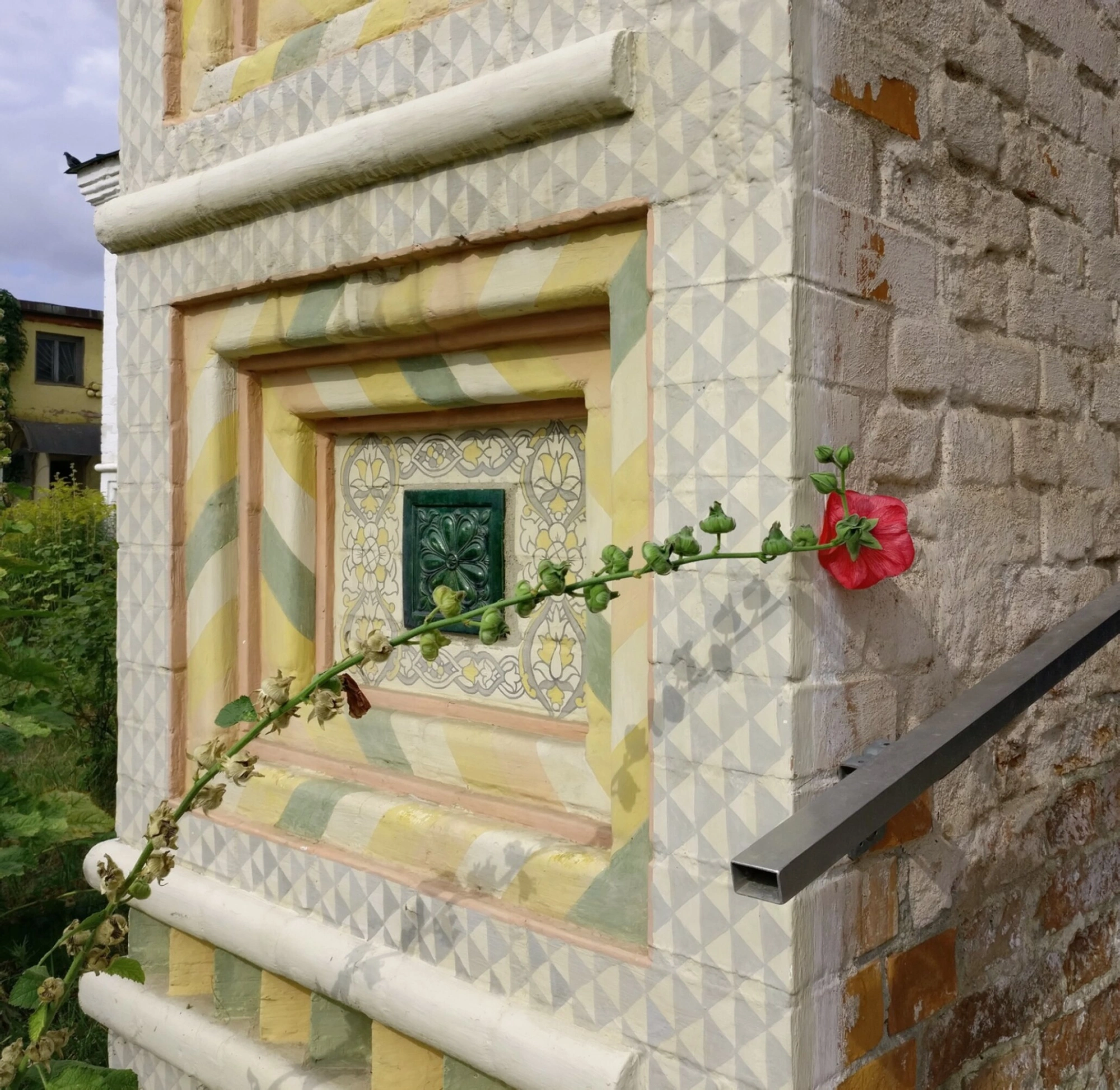 Центральным элементом композиции является оконный проём, характерный для традиционного русского церковного зодчества. Его обрамляет сложный многослойный наличник, выполненный из фигурного кирпича и окрашенный в благостные пастельные тона: охристый, зелёный, розовый и бежевый. Подобный декор, напоминающий резной деревянный орнамент, не только выполняет эстетическую функцию, но и символически обрамляет «окно в горний мир», через которое свет веры проникает в храм. В центре окна установлена ажурная кованая решётка зелёного цвета, оберегающая святыню.