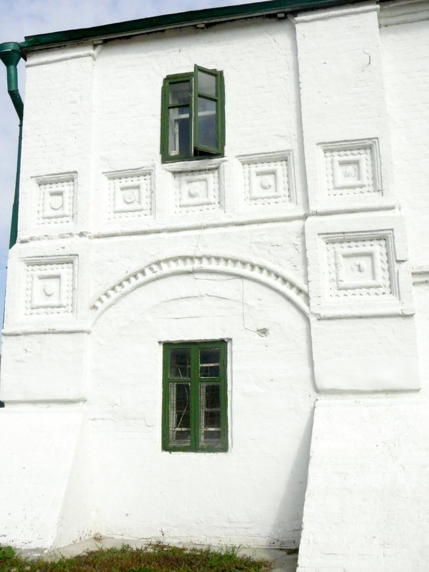 На представленной фотографии запечатлён фрагмент стены одного из зданий Казанского Иоанно-Предтеченского мужского монастыря, являющегося объектом культурного наследия. Белоснежная оштукатуренная стена демонстрирует характерные для церковного зодчества элементы: арочный фриз и квадратные ниши с рельефным узором, которые придают фасаду особую выразительность и монументальность. Сквозь слой штукатурки просматривается текстура исторической кирпичной кладки, свидетельствующая о почтенном возрасте постройки.