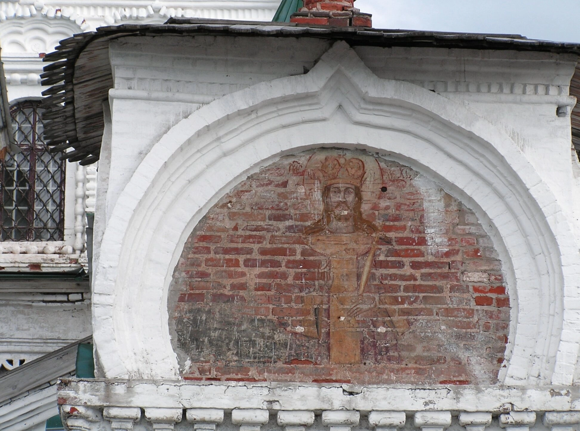 В глубине ниши просматривается старинная фресковая роспись, нанесенная непосредственно на кирпичную кладку. Несмотря на значительное выцветание красок и повреждения штукатурного слоя, различимо погрудное изображение святого лика в царском облачении и венце. Нимб вокруг главы свидетельствует о сакральном характере изображения, вероятно, представляющего одного из христианских святых или Господа Иисуса Христа в образе Царя Небесного.