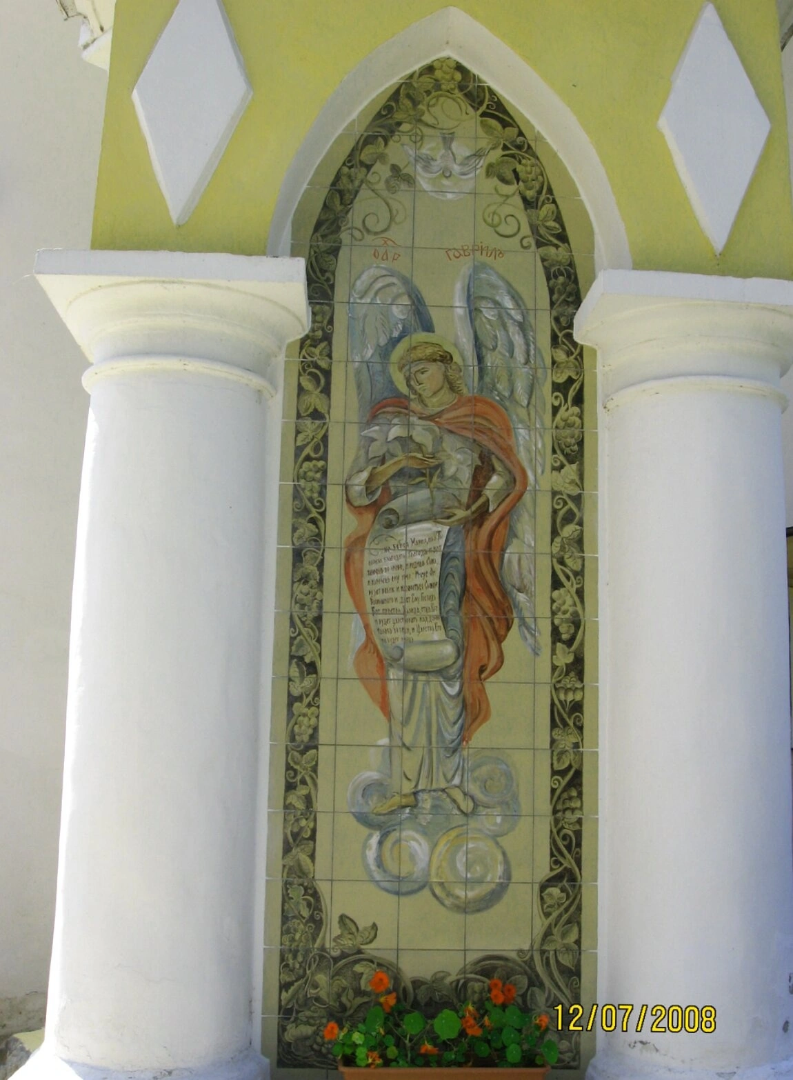 Изображение датируется 2008 годом и представляет собой пример современной храмовой живописи, выполненной в строгом соответствии с древними византийскими и русскими иконописными традициями. Данный образ Архангела Гавриила служит напоминанием о его постоянном предстательстве перед Престолом Божиим и заступничестве за род человеческий.