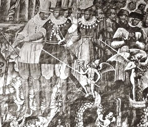 В нижней части фрески различимы изображения змееподобных существ, что традиционно символизирует силы тьмы и греха, попираемые святостью и истинной верой. Присутствие крылатых фигур, кои могут быть восприняты как изображения ангельских чинов, подчёркивает вневременной и горний характер представленного сюжета, его обращённость к вечным вопросам борьбы добра со злом и спасения человеческой души.