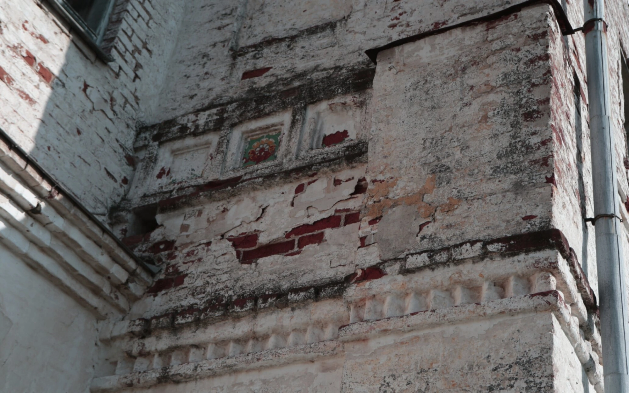 Справа по краю фотографии видна часть водосточной трубы, а вся поверхность стены испещрена тёмными подтёками от дождевой воды, трещинами и сколами, что красноречиво говорит о длительном отсутствии полноценного ремонта. Данный архитектурный фрагмент является наглядной иллюстрацией истории православной России, воплощённой в кирпиче и штукатурке. Он отражает как былое величие церковного зодчества, так и печальное наследие периода запустения, призывая к сохранению уникального духовного и культурного наследия.