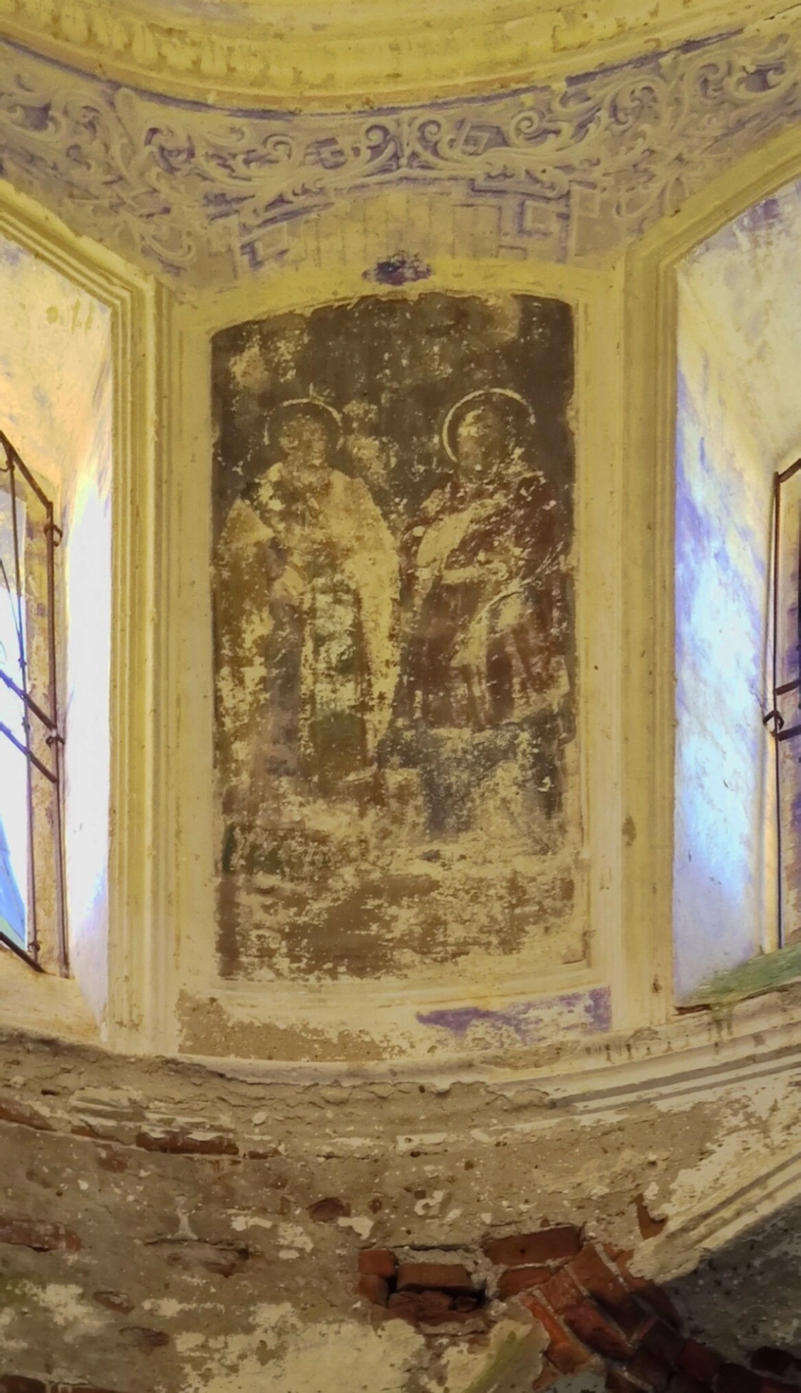 В центральной части композиции находится старинная фресковая роспись, сохранившаяся в алтарной части храма. Несмотря на значительные повреждения и осыпание красочного слоя, на фреске отчетливо различимы образы двух святых, вероятно, архангелов или особо почитаемых святых. Фигуры имеют характерные нимбы, а их одеяния выполнены в традиционной для древнерусской храмовой живописи цветовой гамме с преобладанием охристых, красно-коричневых и светлых тонов.