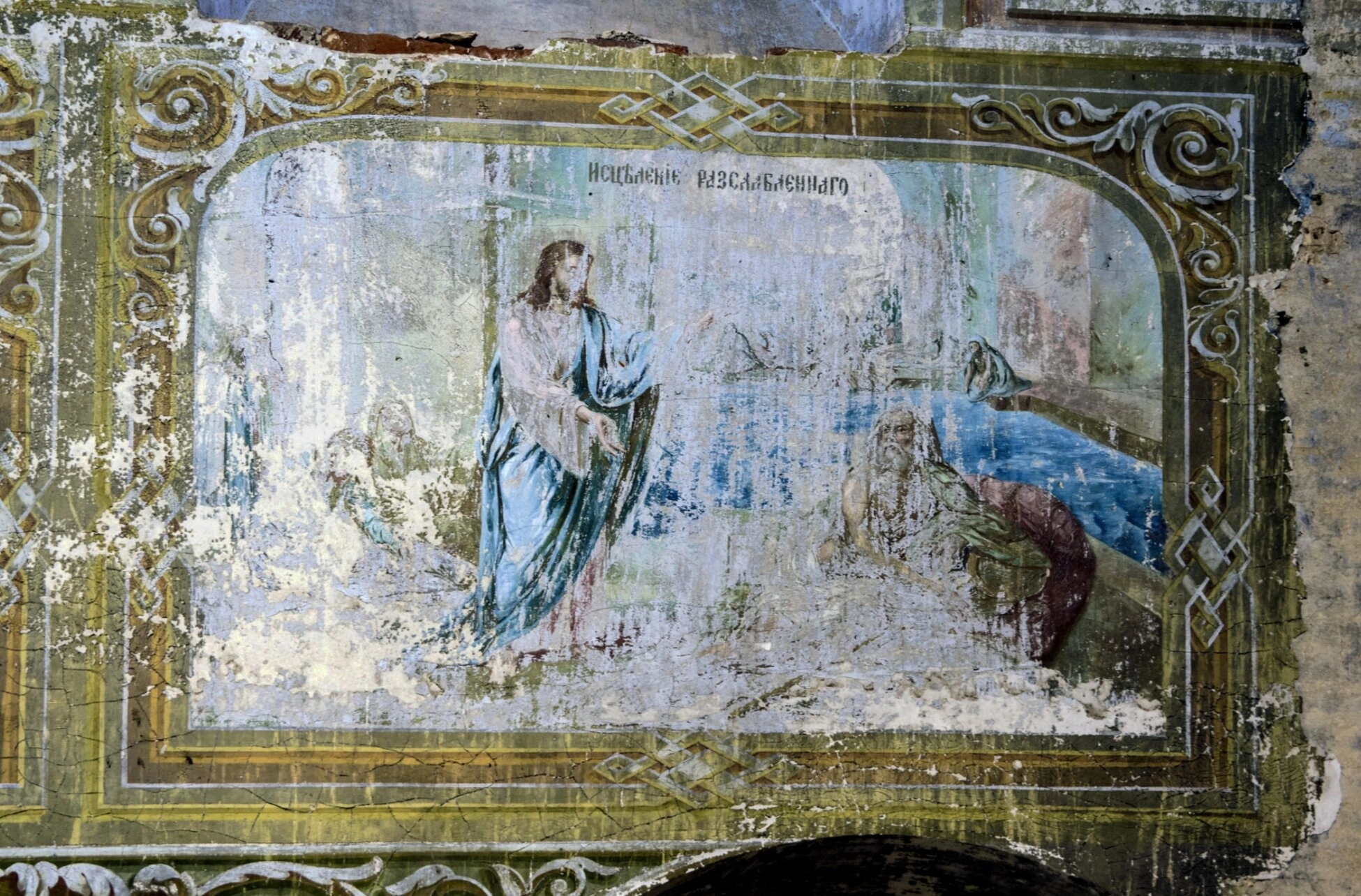 Сюжет фрески в точности соответствует повествованию от Evangelistа Марка (Мк. 2:1-12) и от Матфея (Мф. 9:1-8). В центре композиции изображён Господь Иисус Христос, благословляющим жестом обращённый к расслабленному (парализованному человеку), который лежит на одре. Рядом со Спасителем традиционно изображаются Его ученики-апостолы и народ, бывший свидетелем сего великого чуда. Надпись на церковнославянском языке «ИСЦБАЄТЕ Разслабленнаго» однозначно идентифицирует представленное событие.