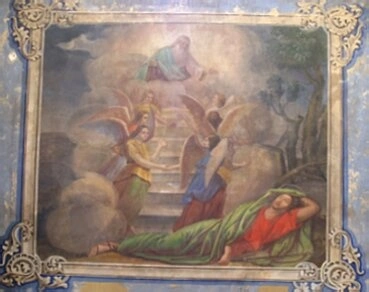 На представленной фреске запечатлён один из фундаментальных ветхозаветных сюжетов — видение лестницы праотцем Иаковом. Согласно Книге Бытия (Быт. 28:12-17), во время бегства от гнева брата своего Исава Иаков, уснув на земле, узрел во сне лестницу, утверждённую на земле и достигающую небес, по которой восходили и нисходили ангелы Божии. На вершине лестницы предстал Сам Господь, подтвердивший завет, данный Аврааму и Исааку, и обещавший Свое покровительство Иакову и его потомству. Это место патриарх назвал Вефилем, что означает Дом Божий, возлив елей на камень, служивший ему изголовьем.