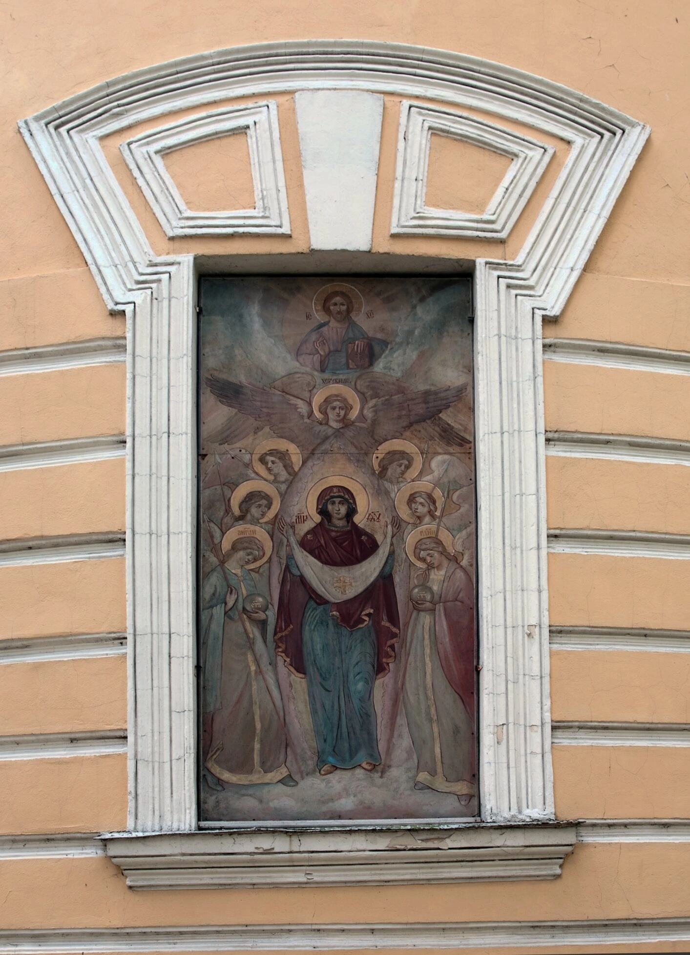 На представленной фотографии запечатлена настенная роспись, размещённая в арочной нише на внешнем фасаде Церкви Покрова Пресвятой Богородицы, что в селе Воскресенское Московской области. Данное священное изображение, выполненное в технике фрески или являющееся внешней иконой, помещено в специально предназначенное углубление (киот) для защиты от непогоды и для молитвенного поклонения верующих перед входом в храм.