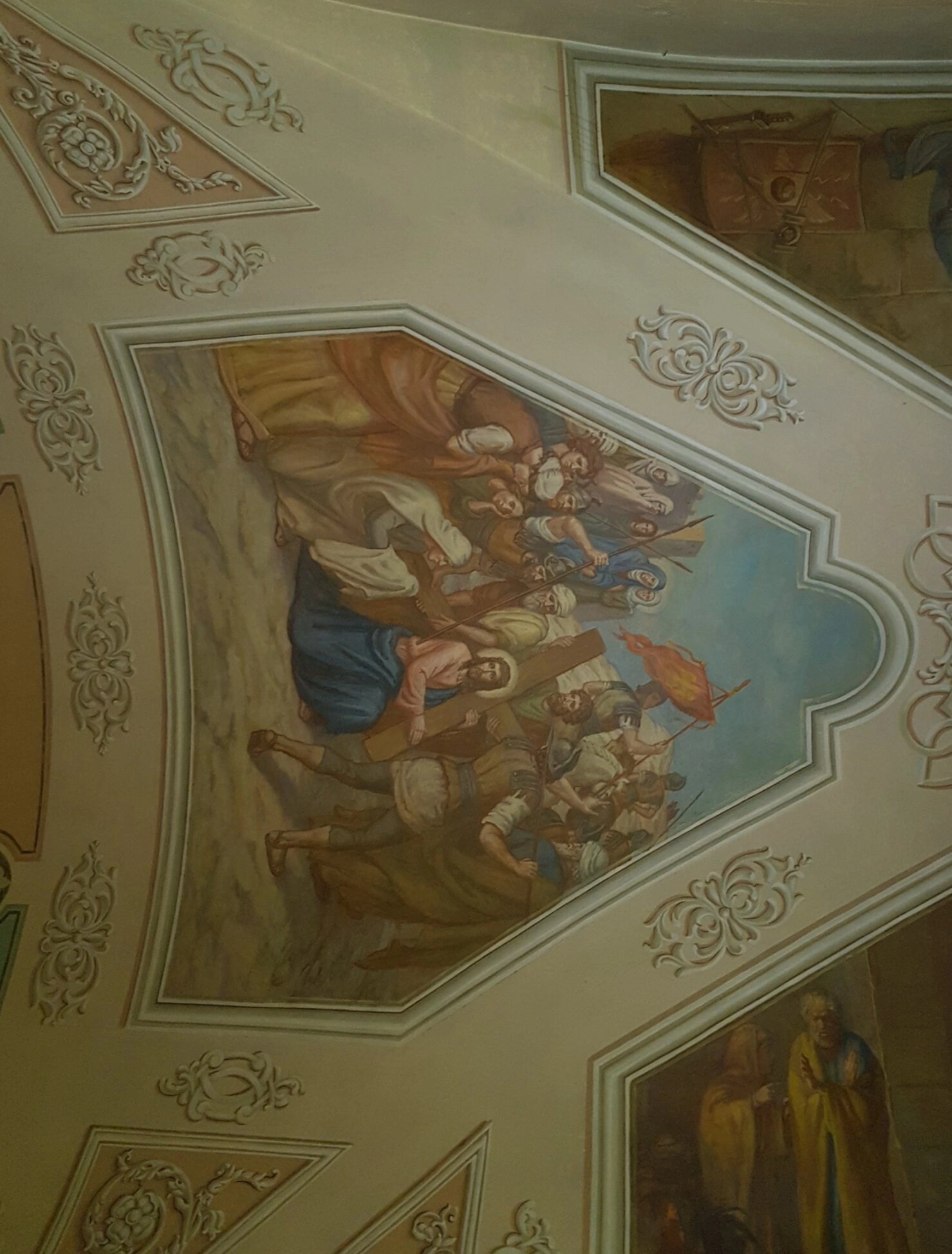На представленной фотографии запечатлена фреска, изображающая шестую остановку (станцию) Крестного пути Господа нашего Иисуса Христа на Голгофу — «Несение Креста». Данное монументальное произведение сакрального искусства находится в московском храме Рождества святого Иоанна Предтечи на Пресне.