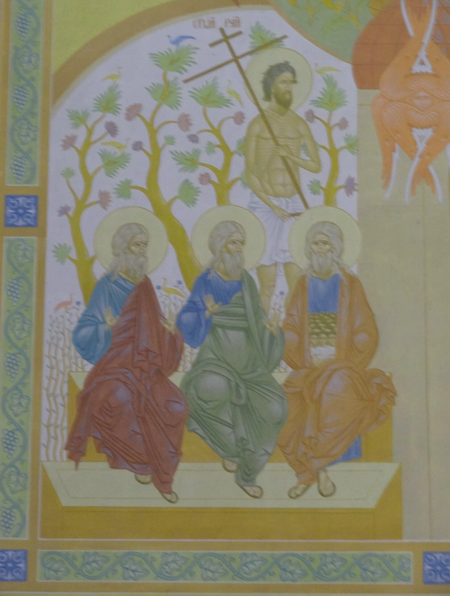 Над сидящими ангелами в арке изображён образ Иоанна Крестителя с крестом в руке. Это пророческое свидетельство указывает на воплощение второй ипостаси Троицы — Сына Божия, принявшего крестную жертву для искупления мира. Фон композиции украшен стилизованными деревьями с пышной листвой, что отсылает к райскому саду и символизирует творение, преображённое Божественным присутствием.