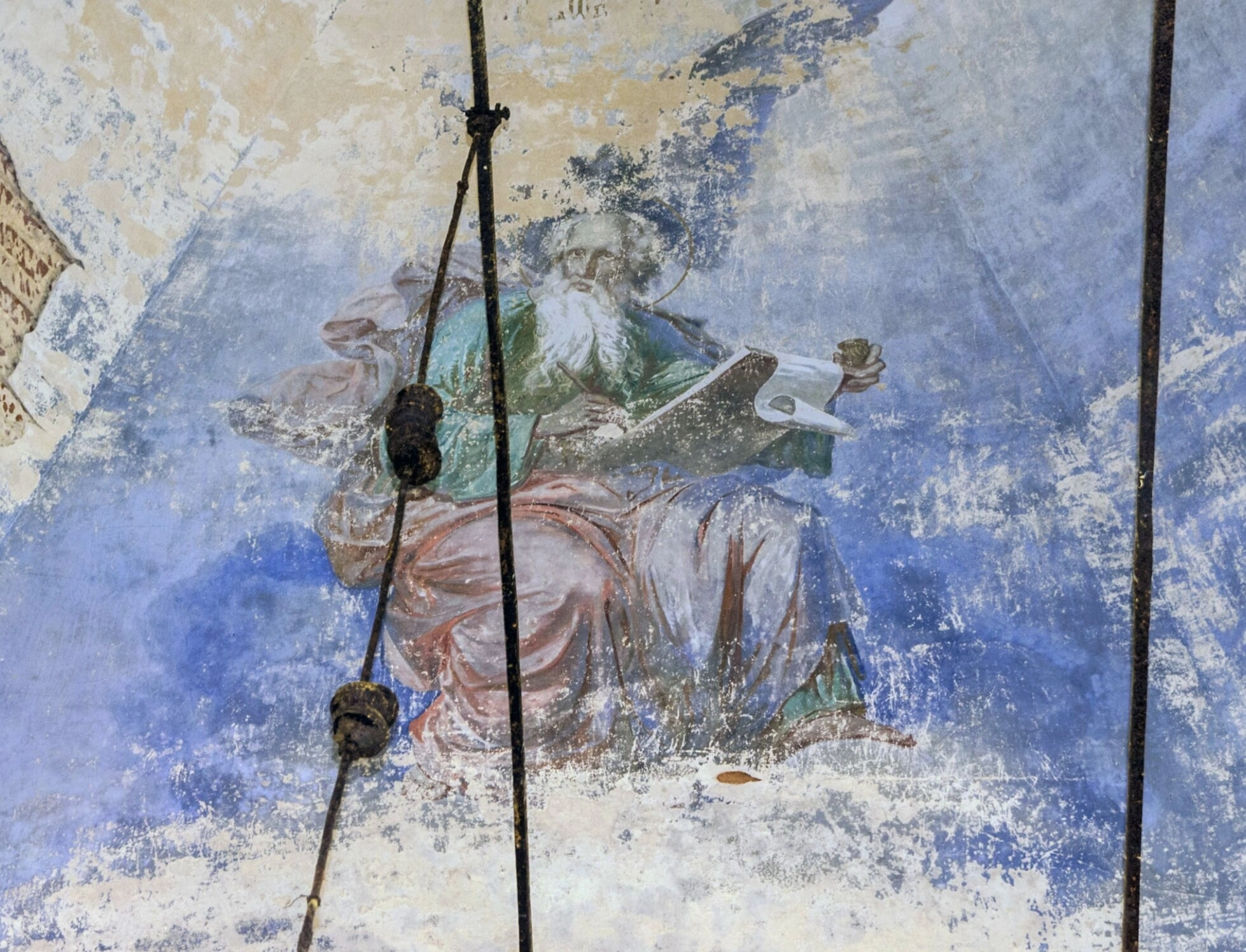 На представленной фотографии запечатлен фрагмент настенной росписи Церкви Спаса Всемилостивого, что в селе Вяз Кировской области. Изображение представляет собой композицию с фигурой ветхозаветного пророка или одного из святых евангелистов. Несмотря на значительные повреждения красочного слоя, вызванные временем, можно различить образ седовласого мужа, облаченного в традиционные одеяния. В его руках запечатлен свиток или священная книга, что является каноническим атрибутом, символизирующим Божественное Откровение и пророческое служение.