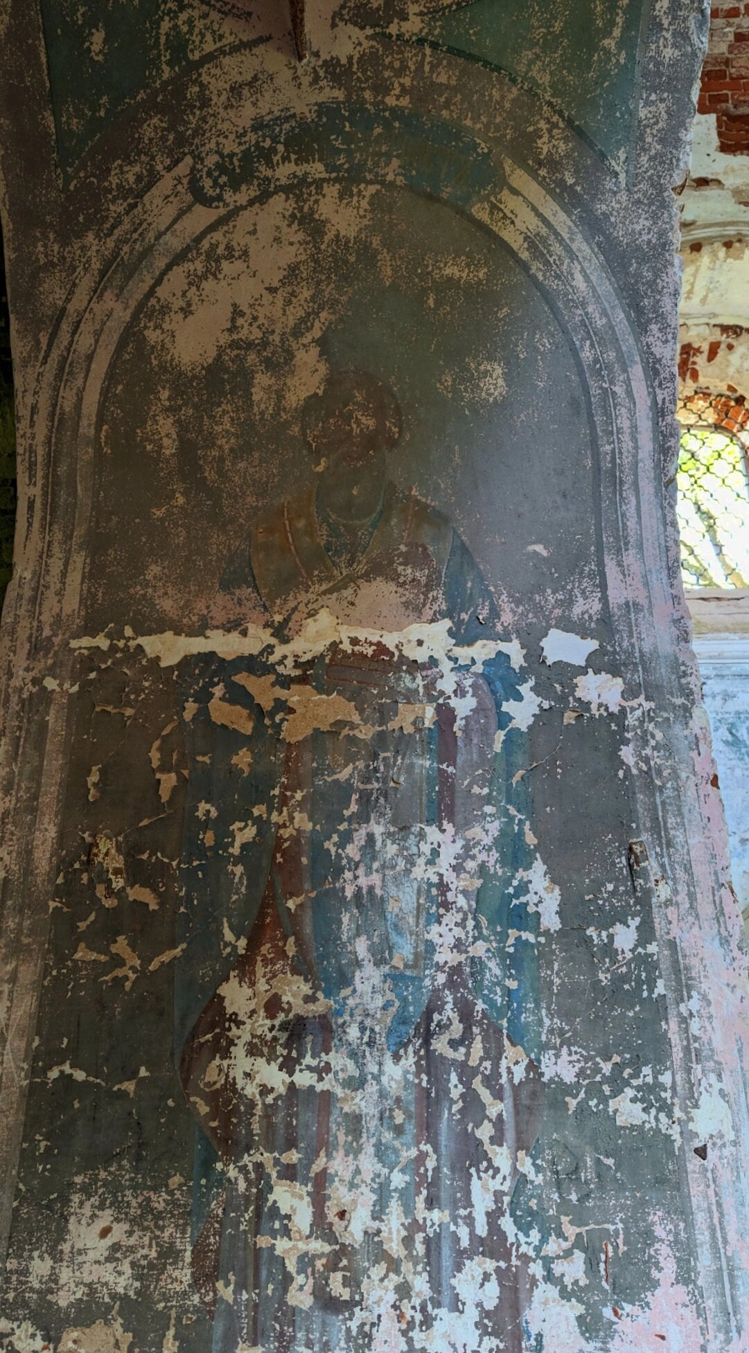 В верхней части композиции, под арочным завершением, сохранилось изображение святого угодника Божия. Лик святого и его нимб частично уцелели, несмотря на значительные повреждения росписи. Художественная манера исполнения характерна для традиционной православной храмовой живописи, где каждый образ несет глубокое духовное значение.