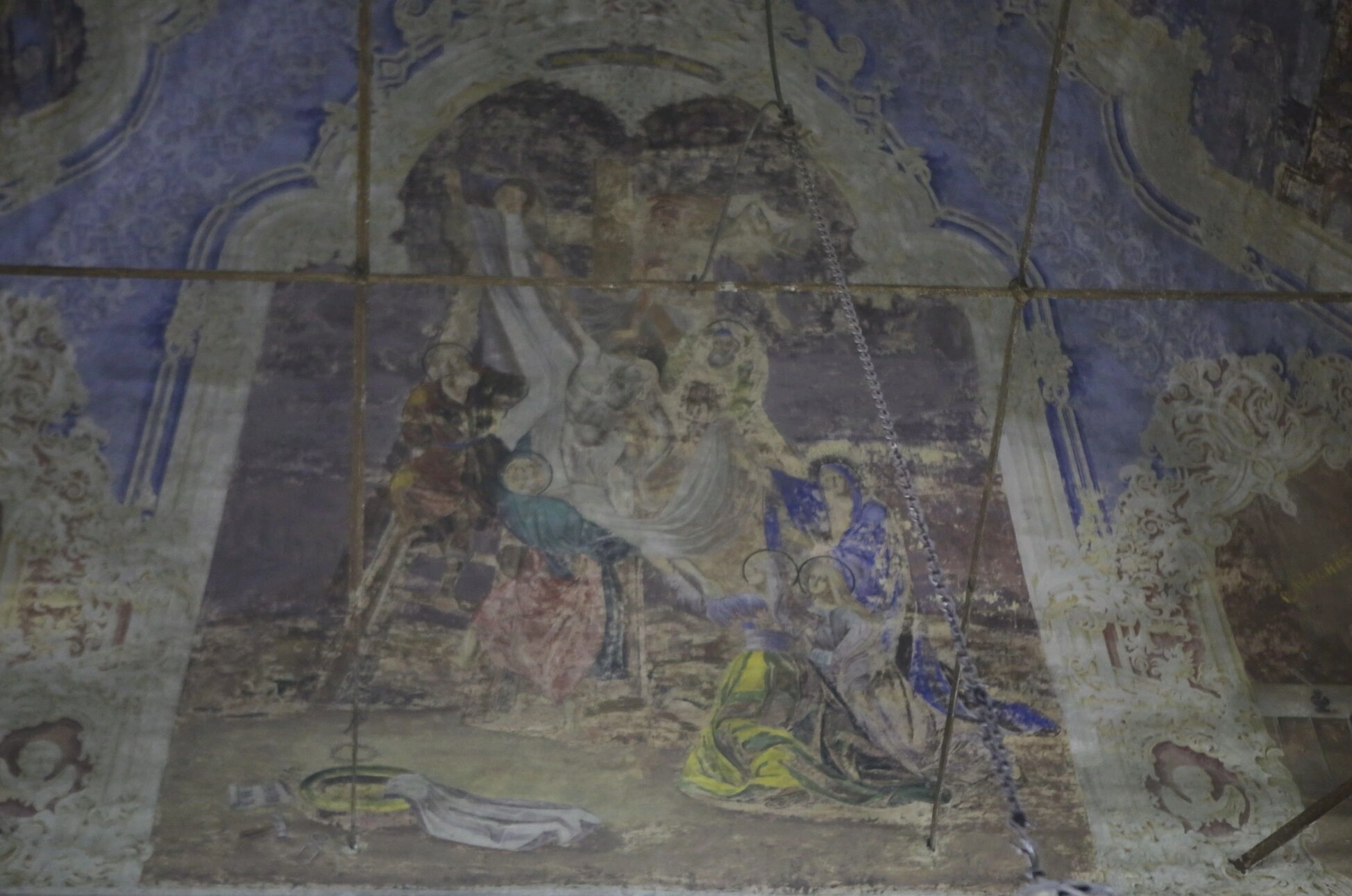На представленной фотографии запечатлена уникальная старинная фреска, изображающая евангельское событие — Снятие с Креста Господа нашего Иисуса Христа. Роспись расположена на своде храма и является частью монументального ансамбля настенной живописи Церкви Троицы Живоначальной в селе Новое Некрасовского района Ярославской области.