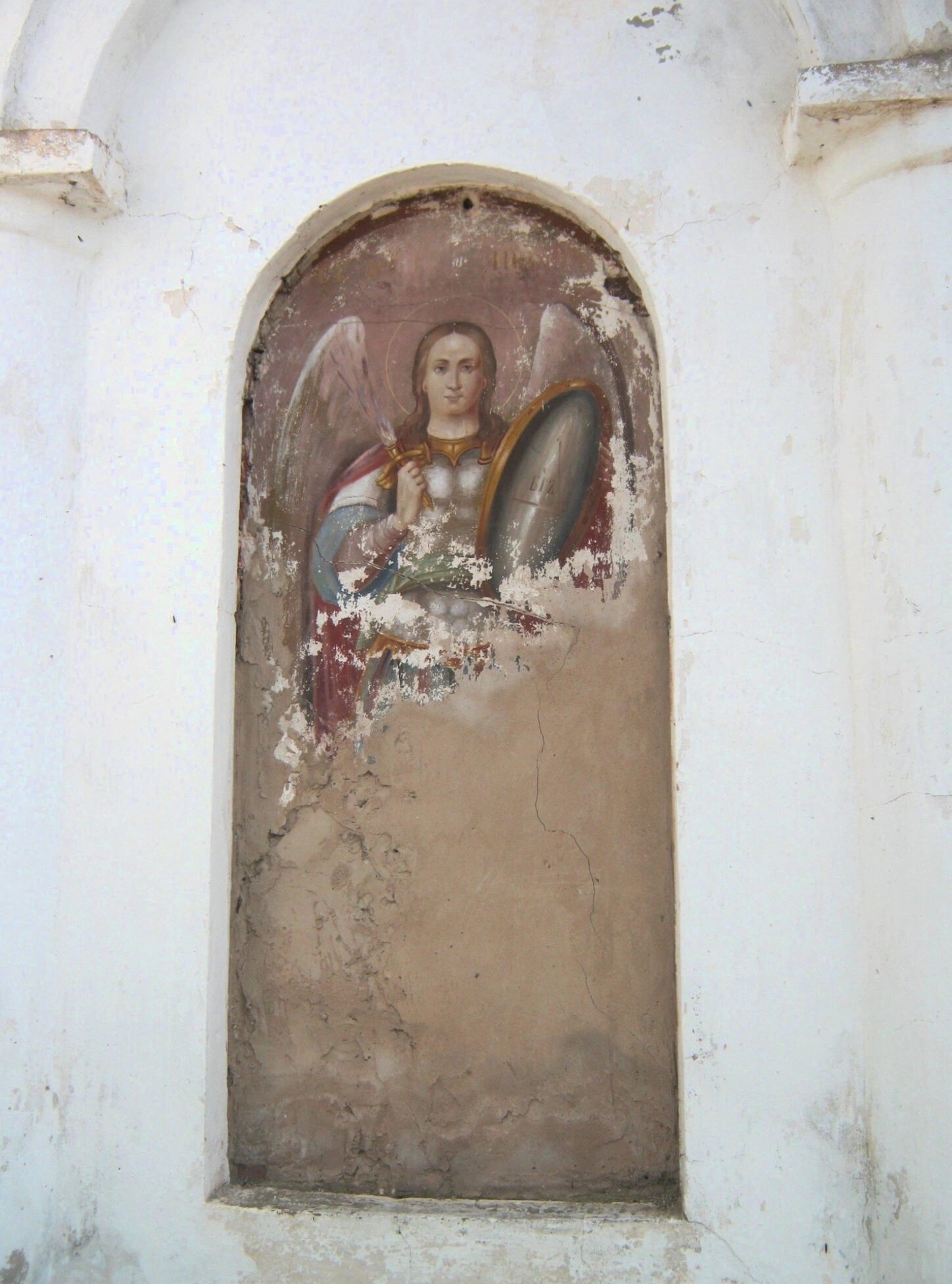 На сохранившейся части фрески просматривается образ небесного заступника – святого архангела или мученика-воина в доспехах. В его деснице угадывается меч – символ духовной брани, а в левой руке он держит щит, олицетворяющий веру и защиту. Тёмный фон, на котором изображена фигура, подчёркивает её величие и выделяет на фоне белоснежной стены храма.