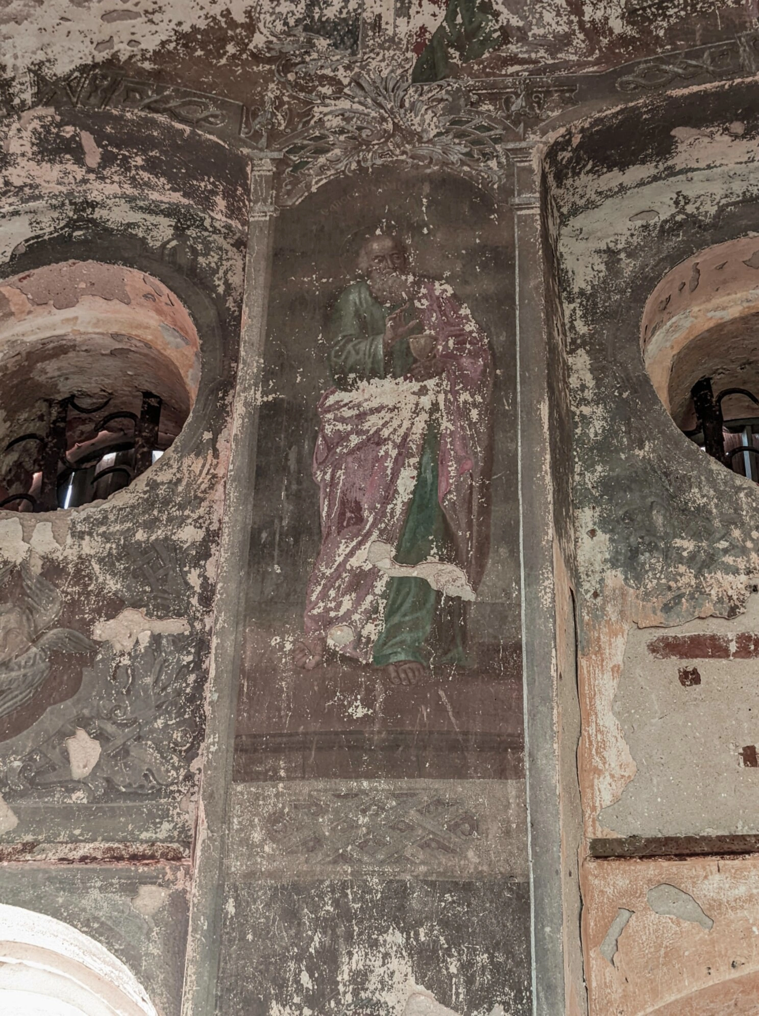 Стены вокруг священного изображения находятся в ветхом состоянии. Штукатурный слой местами осыпался, видны глубокие трещины и следы разрушения. По бокам от фрески расположены два арочных оконных проема, через которые в храмовое пространство проникает естественное освещение. Эти архитектурные элементы также несут на себе следы длительного запустения.