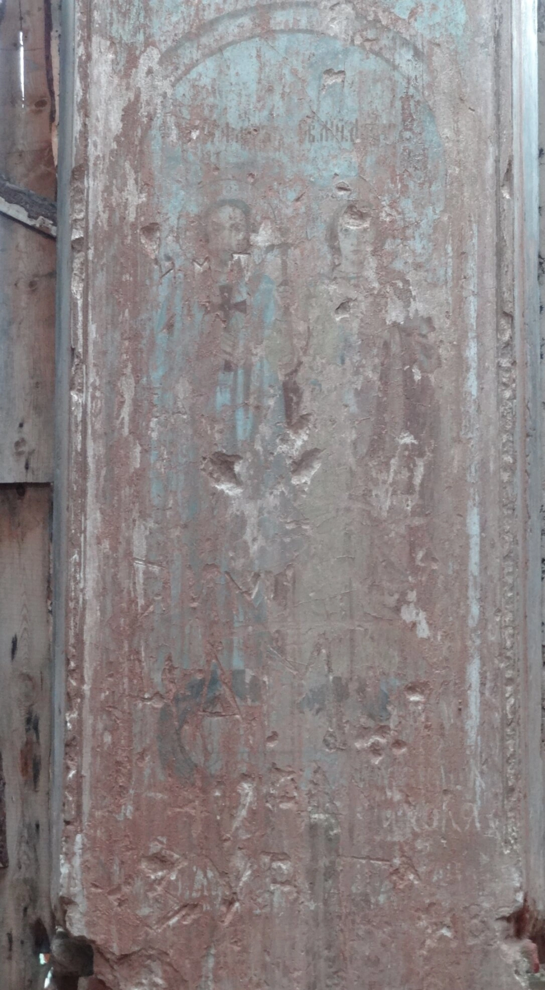 На представленной фотографии запечатлён фрагмент внутреннего убранства Храма во имя Святителя Николая Чудотворца, что расположен в селе Исетском. Изображение демонстрирует участок сильно повреждённой временем настенной росписи. Несмотря на значительные утраты красочного слоя и штукатурки, внимательный взгляд может различить очертания святого образа, выполненного в канонической манере православной иконописи.