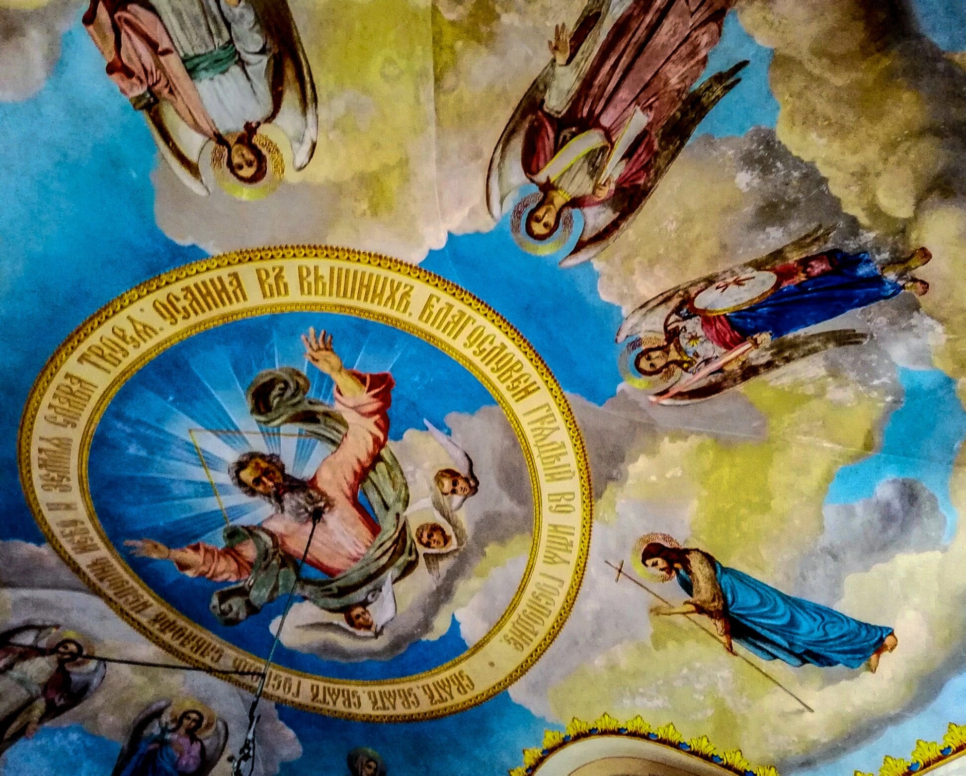 Пространство между центральным медальоном и подкупольным барабаном заполнено изображениями парящих в небесной сфере ангельских сил. Ангелы, представленные в динамичных позах, облачённые в светлые хитоны, славят Господа, участвуя в великом празднике Вознесения. Их фигуры символизируют непрестанное ангельское служение и предстояние Божественному Престолу.