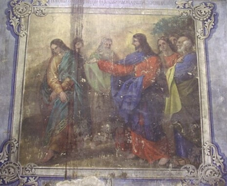 На представленной фотографии запечатлена уникальная фреска из храма Рождества Христова, расположенного в селе Уланок. Роспись изображает глубоко поучительную евангельскую сцену, центральными фигурами которой являются Господь Иисус Христос и юноша, обращающийся к Нему с вопросом. Спаситель облачён в традиционные для иконографии одеяния багряного и синего цветов, символизирующие Его Божественное достоинство и воплощение. Протянутая десница Христа в жесте благословения или наставления подчёркивает Его роль как Учителя и Наставника.