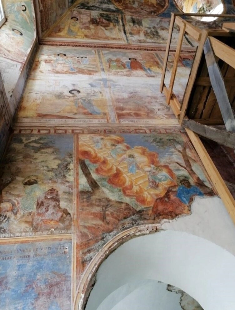 С 2018 года в храме проводятся масштабные реставрационные работы под руководством Санкт-Петербургской государственной художественно-промышленной Академии имени А. Л. Штиглица . Специалисты укрепляют штукатурное основание и красочный слой, выполняют расчистку от поверхностных загрязнений и восполняют утраты живописного слоя . Деревянные конструкции, visible на фотографии, могут свидетельствовать о проведении реставрационных работ, направленных на сохранение этого уникального культурного наследия.