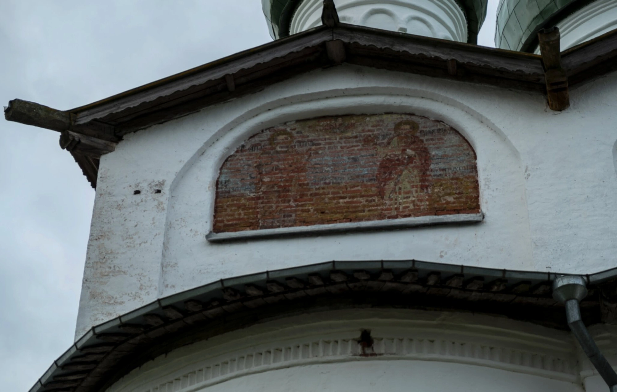 На изображении явственно видна каменная кладка внешней стены храма, характерная для северной православной архитектуры. В нише стены сохранились благодатные фресковые росписи, изображающие лики святых угодников Божиих. Эти фрагменты древней живописи, хотя и подверглись воздействию времени, несут в себе отблеск былого духовного величия и мастерства благочестивых иконописцев.