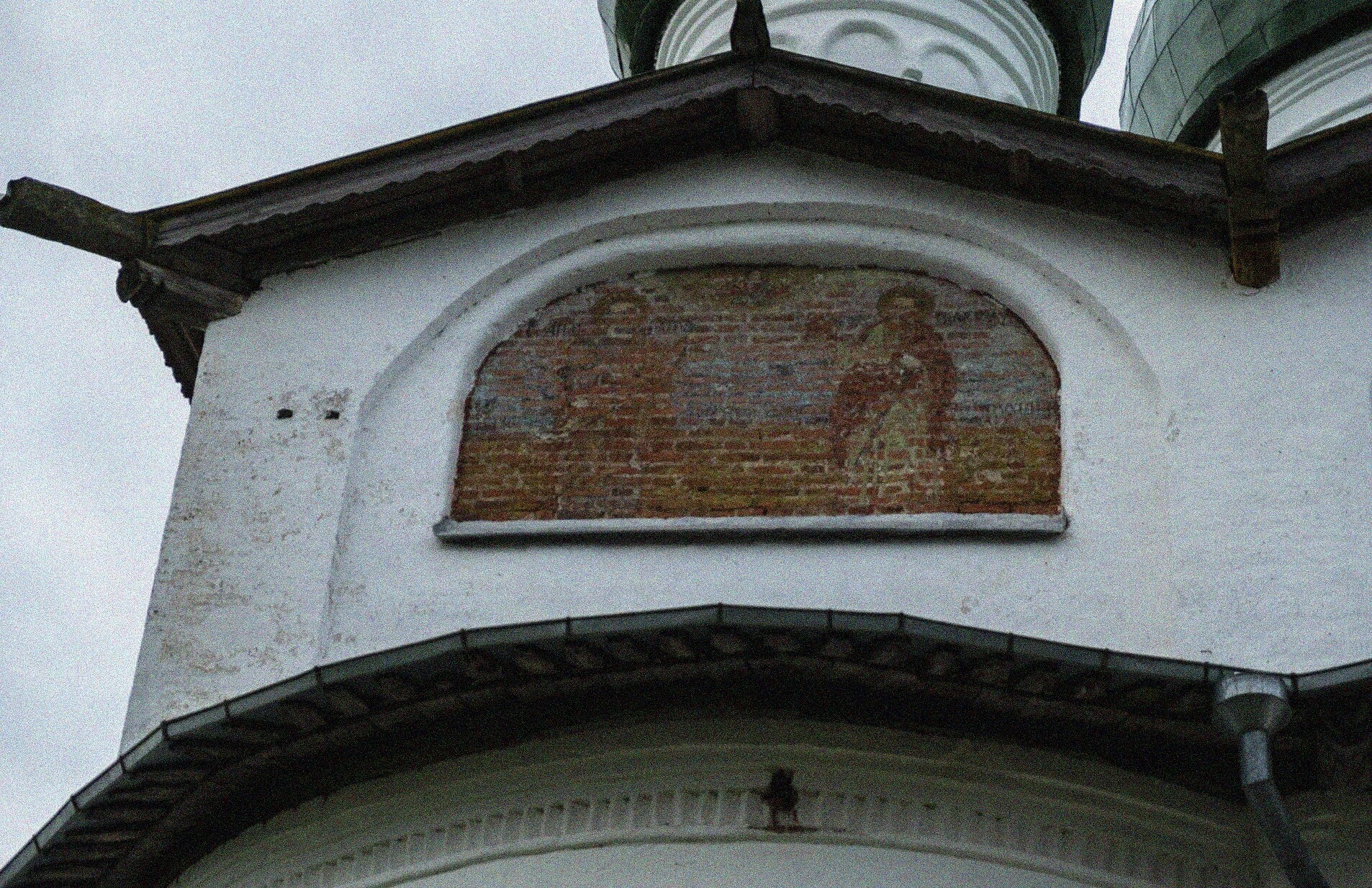На представленной фотографии запечатлён фрагмент северного фасада собора Святителя Николая Чудотворца, что в ставропигиальном Вяжищском монастыре. Взору открывается беленый участок стены, свидетельствующий о многовековой истории обители, с проступающими элементами древней кирпичной кладки.