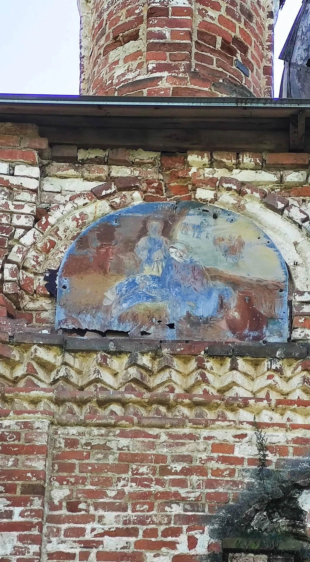 В центральной части ниши угадываются лики и фигуры святых, написанные в традиционной для русского церковного искусства цветовой гамме: охристые, красные и синие тона. Несмотря на сильные повреждения, можно предположить, что композиция изображала один из праздничных сюжетов или группу святых угодников. Сама ниша выполнена из красного кирпича и украшена beneath декоративным фризом с изящным узором «в ёлочку», что характерно для храмового зодчества конца XIX — начала XX веков.