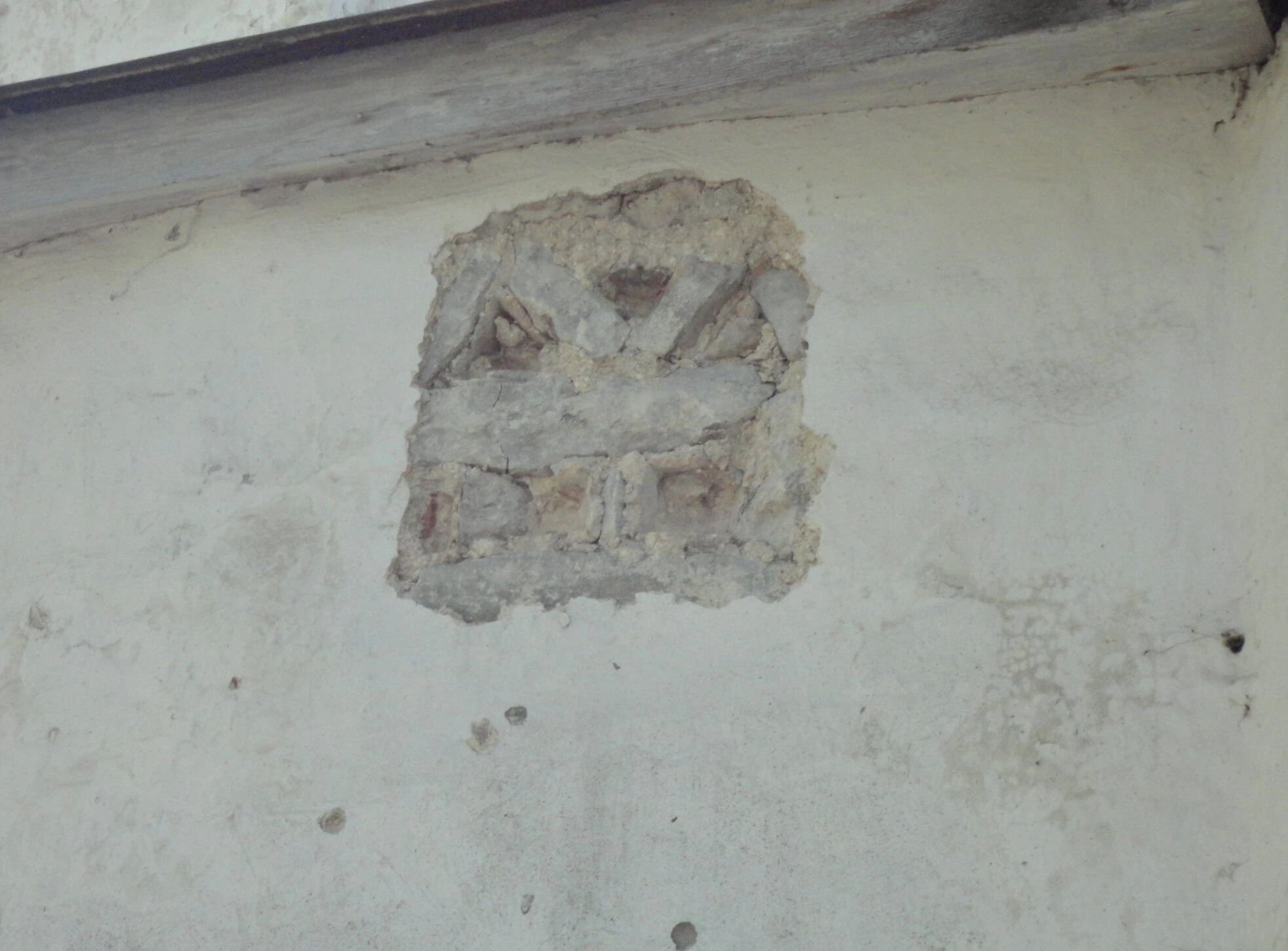 На представленном изображении запечатлён фрагмент стены древнего православного храма, несущий на себе следы многовековой истории. Под слоем повреждённой штукатурки или побелки обнажается подлинная кирпичная кладка, свидетельствующая о древней конструкции здания. Выше повреждённого участка различим деревянный брус, являющийся частью архитектурного каркаса святыни.