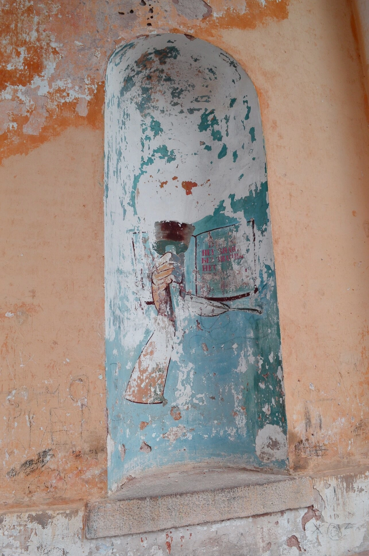 На представленной фотографии запечатлён фрагмент древней настенной росписи, сохранившейся в полукруглой нише стены Церкви Богоявления Господня, что расположена в селе Яконово Старицкого района Тверской области. Изображение являет собою десницу, указующую на раскрытую книгу, что в христианской иконографии традиционно символизирует Божественное Откровение, Священное Писание или Книгу Жизни.