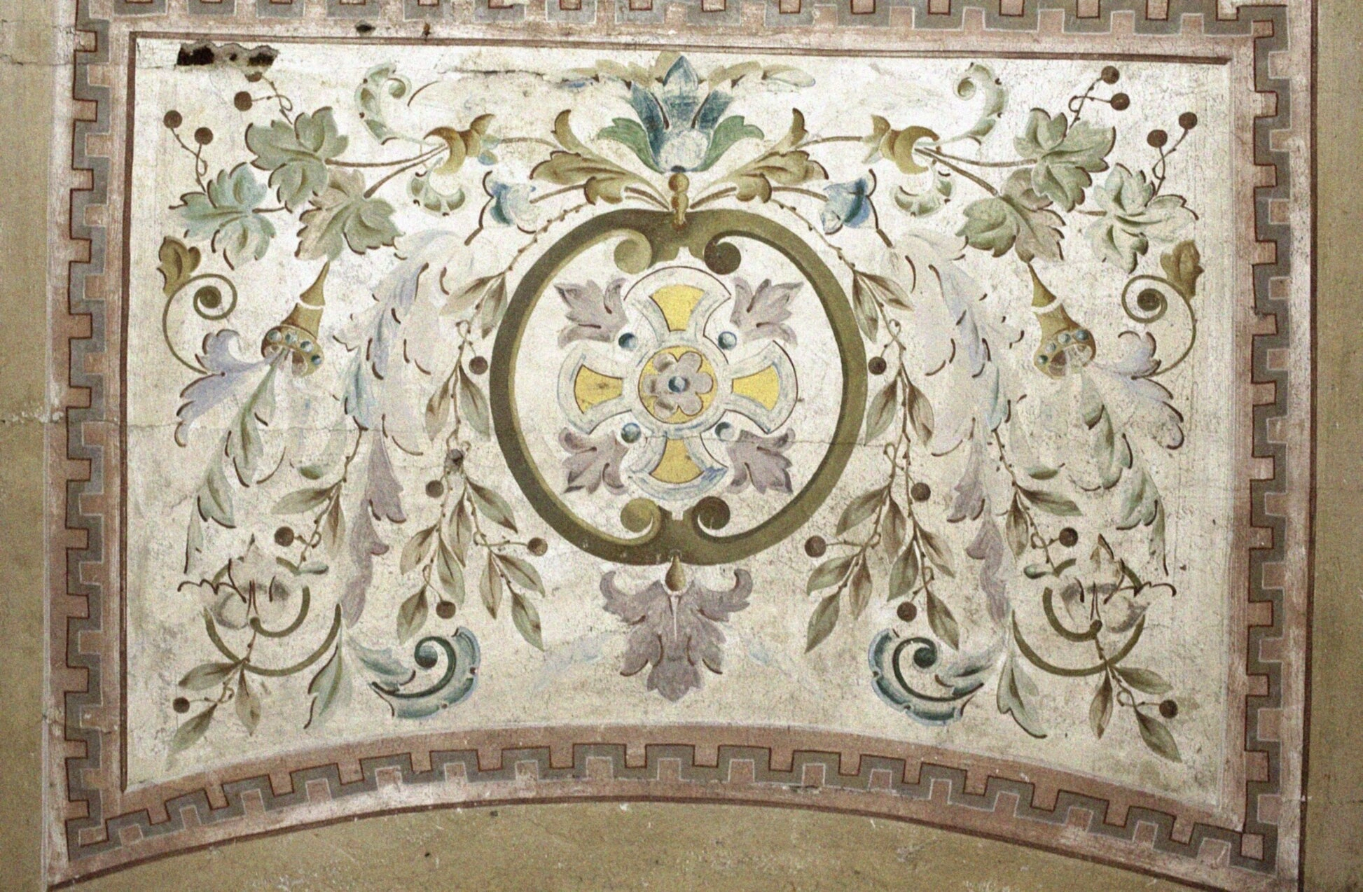 Композиционным центром росписи выступает крупный медальон круглой формы, декорированный сложным орнаментом, напоминающим одновременно и процветший крест, и небесную розу. Выполненный в золотистых, охристых и сиреневых тонах, он символизирует сияние Царства Небесного и славу Божию. От центрального медальона симметрично расходятся стилизованные растительные узоры, изображающие побеги, листья и цветы. Эта символика отсылает к образу райского сада и духовного процветания.