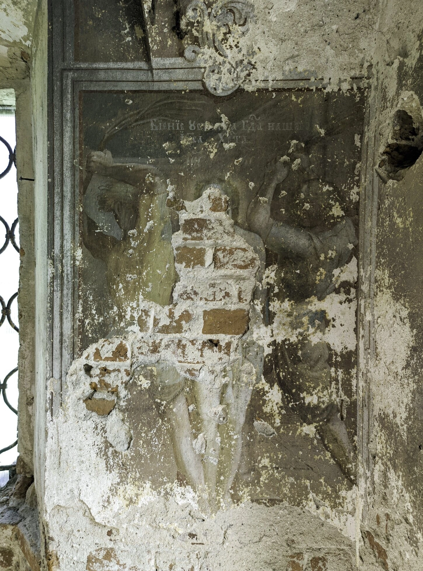 Обрамление росписи включает элементы декоративной лепнины, частично сохранившиеся по периметру фрески. С левой стороны композиции находится оконный проем с кованой металлической решеткой, характерной для церковной архитектуры. Состояние росписи требует проведения срочных консервационных работ для сохранения уцелевших фрагментов этого уникального памятника церковного искусства.