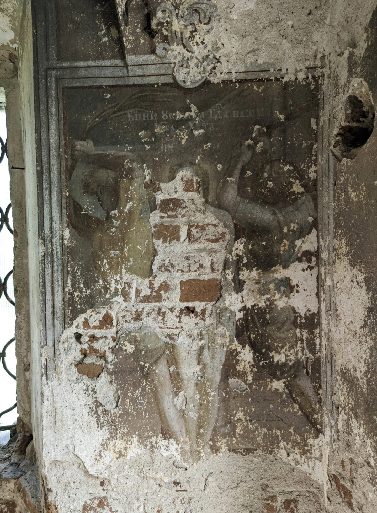В верхней части композиции различимы две фигуры, исполненные в традиционной православной иконографии. Стилистические особенности изображения позволяют предположить, что это образы ангелов, поддерживающих верхнюю часть декоративного убранства. Их позы и жесты характерны для храмовой росписи, где небесные силы часто изображаются как служители Божественного Престола.