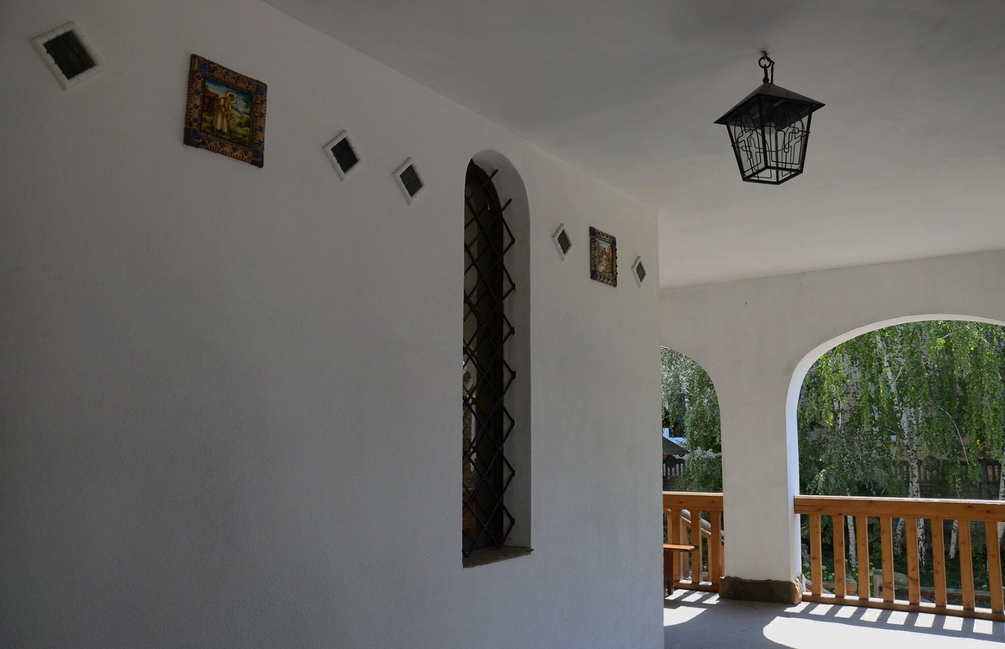 Особого внимания заслуживают элементы внутреннего убранства. На стене размещены две иконы в резных рамах, предназначенные для молитвенного созерцания верующими. Центральным элементом освещения является подвесной кованый светильник-фонарь, выполненный в традициях православной храмовой металлопластики. Потолочное пространство украшено четырьмя квадратными нишами, что добавляет архитектурной композиции объем и ритмичность.