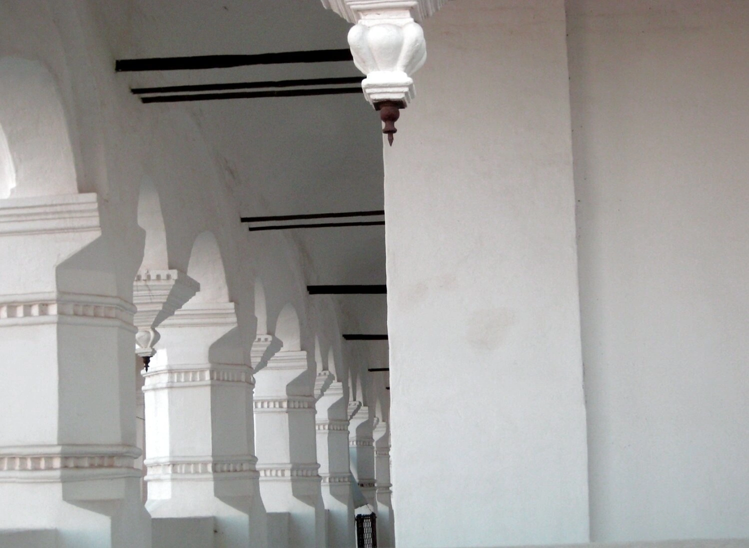 Архитектурное пространство галереи характеризуется гармоничным сочетанием монументальности и изящества. Массивные белоснежные колонны с искусно выполненными резными капителями уверенно поддерживают арочные своды, создавая ощущение незыблемости и вечности. Ритмичное чередование арок формирует глубокую перспективу, направляющую взгляд в священное пространство храма.