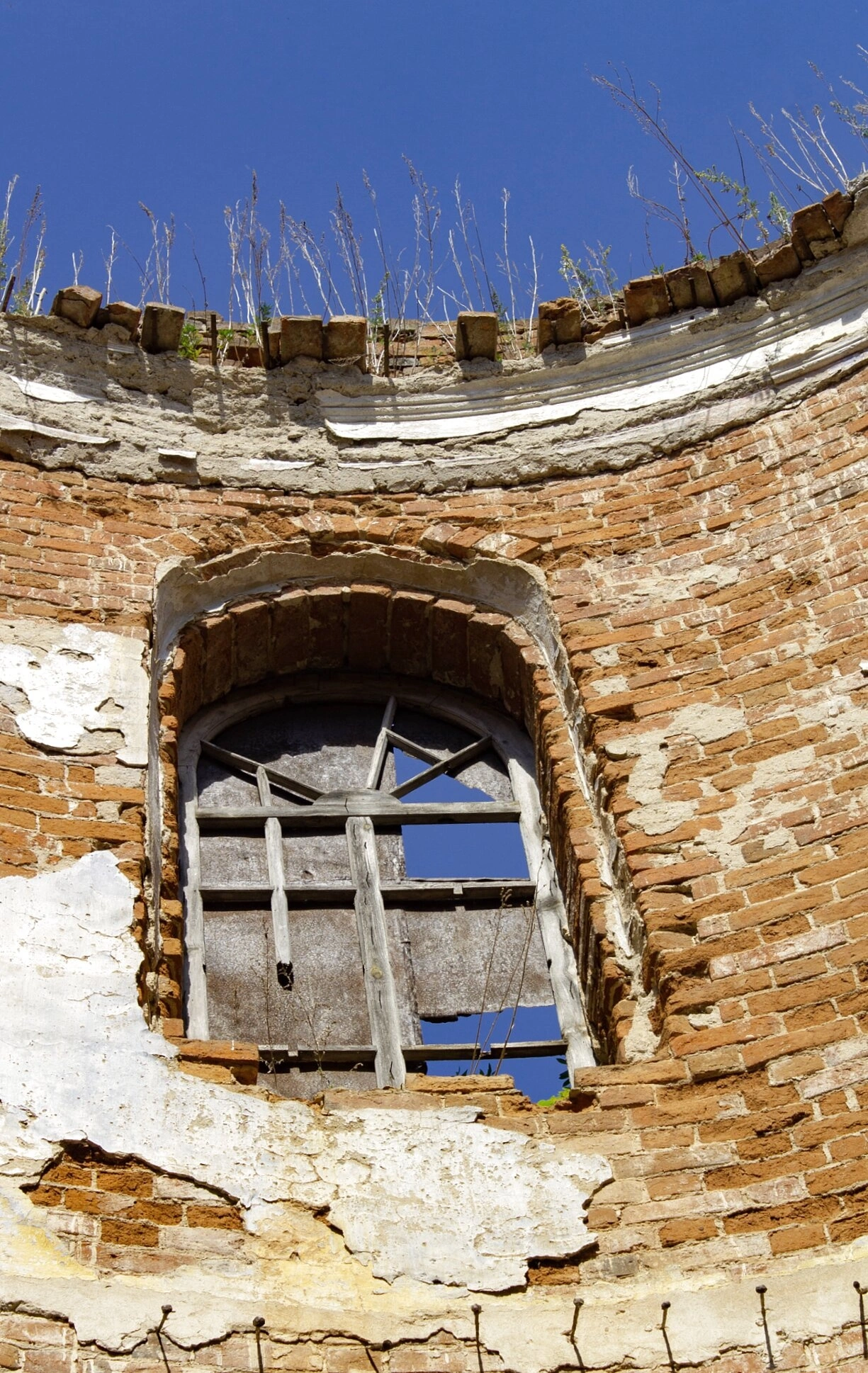 Состояние запечатлённого фрагмента храма свидетельствует о его длительном пребывании без должного присмотра. Кирпичная кладка местами имеет значительные повреждения, а оконный проём лишён остекления, что является характерными признаками запустения православной святыни. Исторические источники не сохранили точных сведений о времени основания этой церкви, однако её архитектурные детали позволяют отнести строительство к периоду расцвета русского храмового зодчества в центральных регионах России.