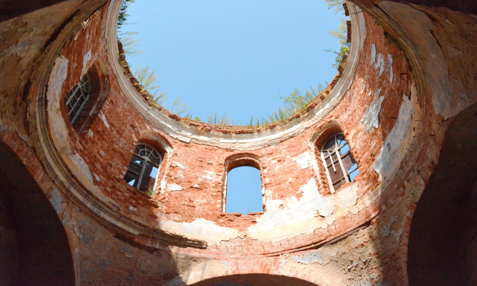 В центральной части композиции возвышается купол храма, пронизанный естественным светом, который проникает через арочные оконные проёмы. Эти световые лучи символизируют Божественное присутствие и озаряют внутреннее пространство разрушенного, но не утратившего духовной силы храма. Каменная кладка купола демонстрирует мастерство русских зодчих, создававших эту святыню для молитвенного предстояния верующих перед Господом.