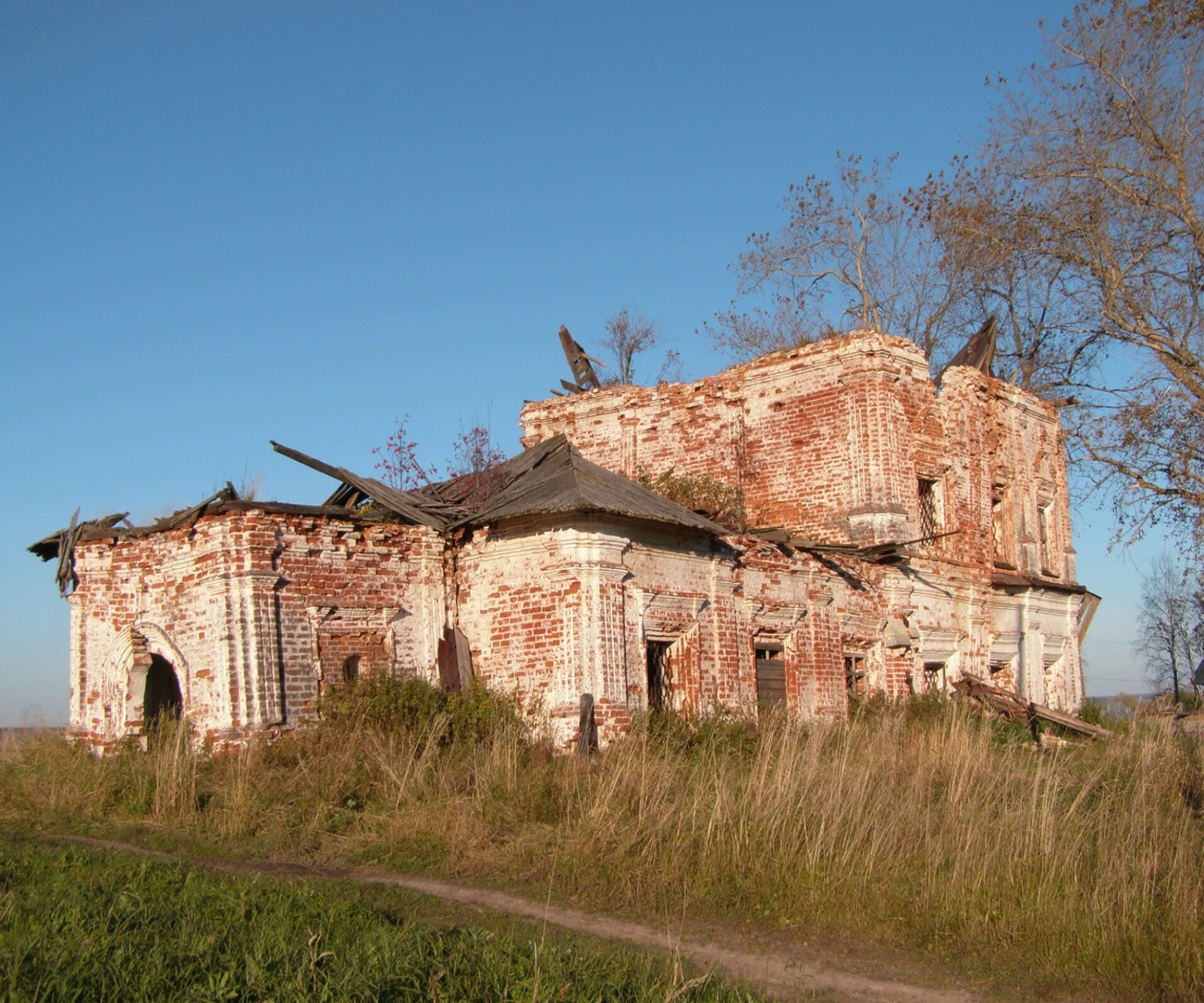 Храмовая постройка датируется XIX столетием и выполнена из красного кирпича в традициях православного зодчества Русского Севера. К сожалению, время и забвение не пощадили святыню: здание пребывает в полуразрушенном состоянии, полностью утрачена кровля, частично обрушились стены и междуэтажные перекрытия.