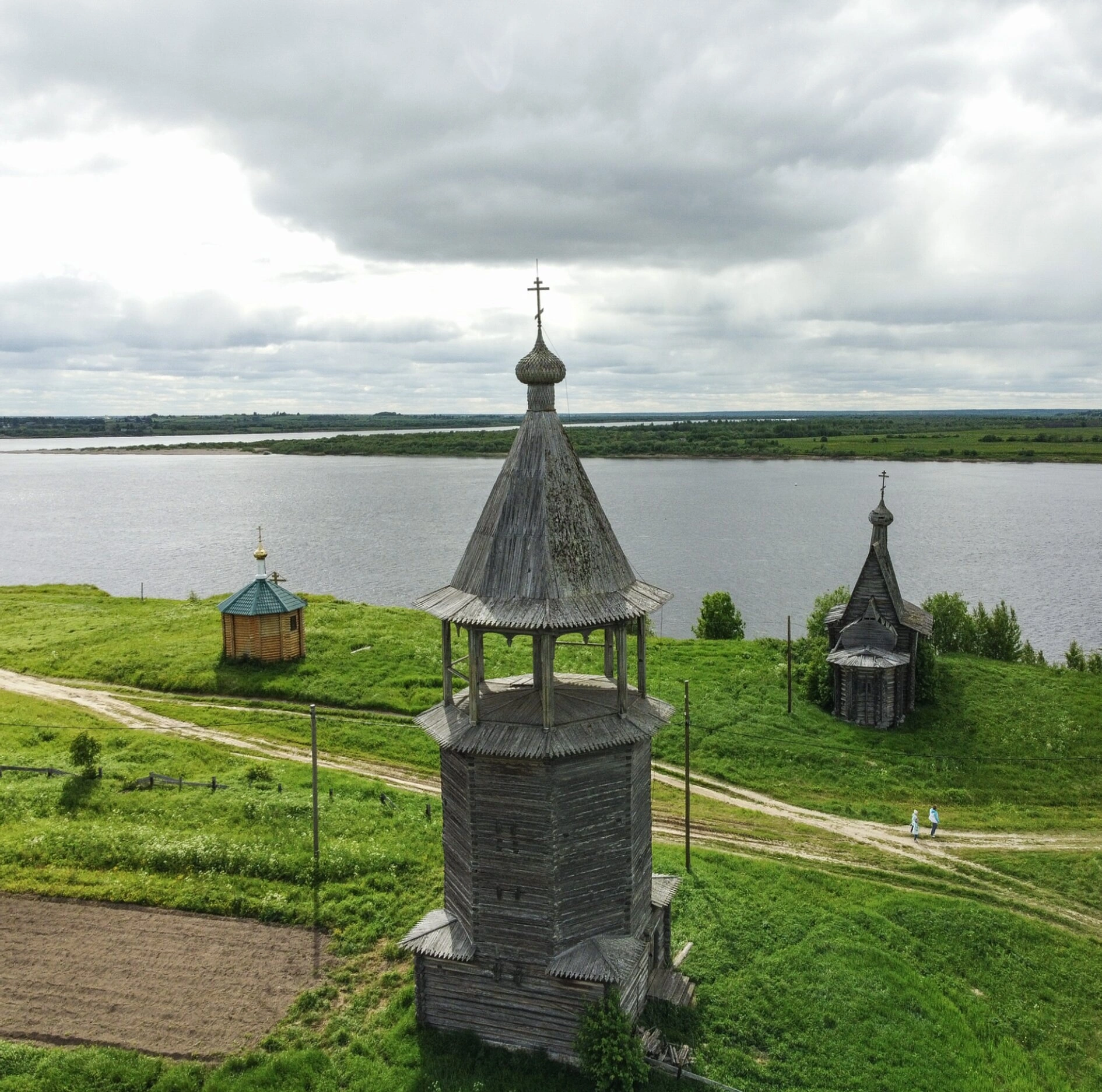 На представленной фотографии запечатлён уникальный памятник русского деревянного зодчества — архитектурный ансамбль Георгиевской церкви, расположенный в деревне Верхняя Паленьга Холмогорского района Архангельской области. Храмовый комплекс возвышается на живописном берегу величественной Северной Двины, создавая гармоничное единство творения человеческих рук и северной природы.