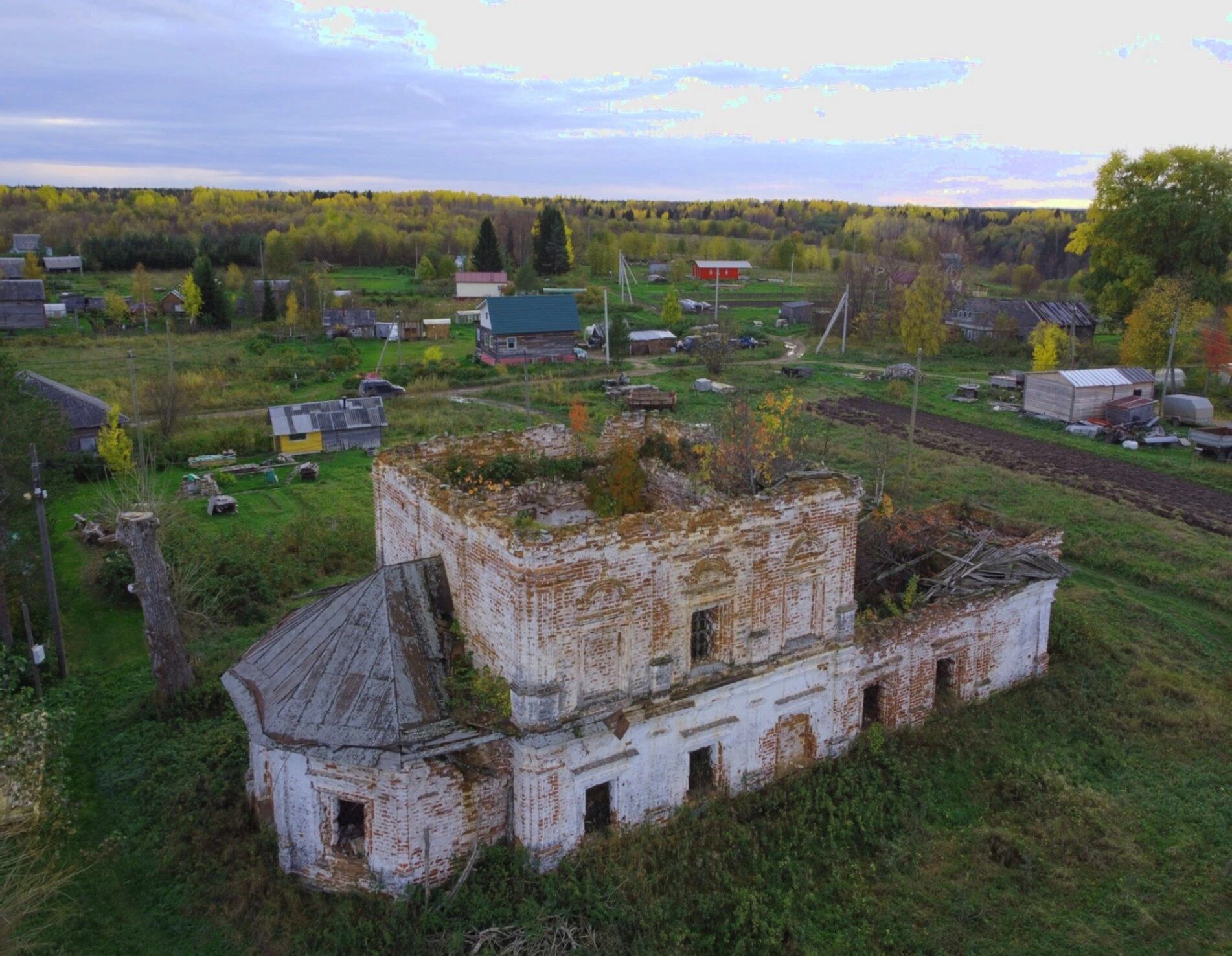 На представленной фотографии запечатлена полуразрушенная Георгиевская церковь, расположенная в деревне Верхняя Паленьга Холмогорского района Архангельской области. Храм находится на возвышенности в живописной сельской местности, окружённой лугами и кустарниками.