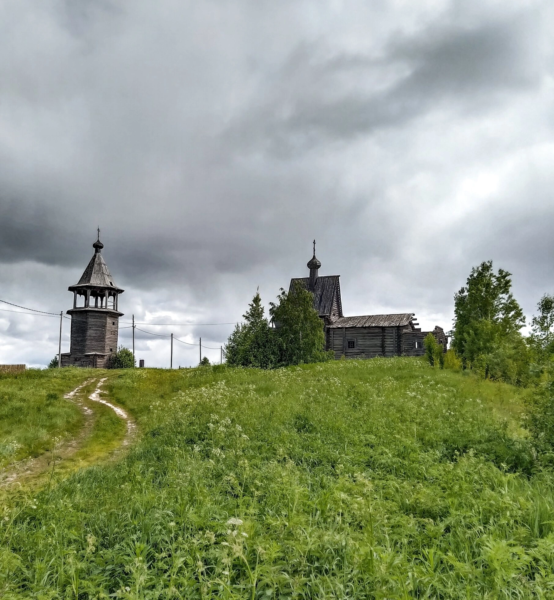 На переднем плане фотографии видна извилистая грунтовая тропа, ведущая к храмовому комплексу, расположенному на вершине живописного холма. Основное здание церкви представляет собой традиционный срубный храм, выполненный из добротных бревен и увенчанный одноглавым куполом с православным крестом. Рядом с церковью возвышается шатровая колокольня, характерная для северной храмовой архитектуры.