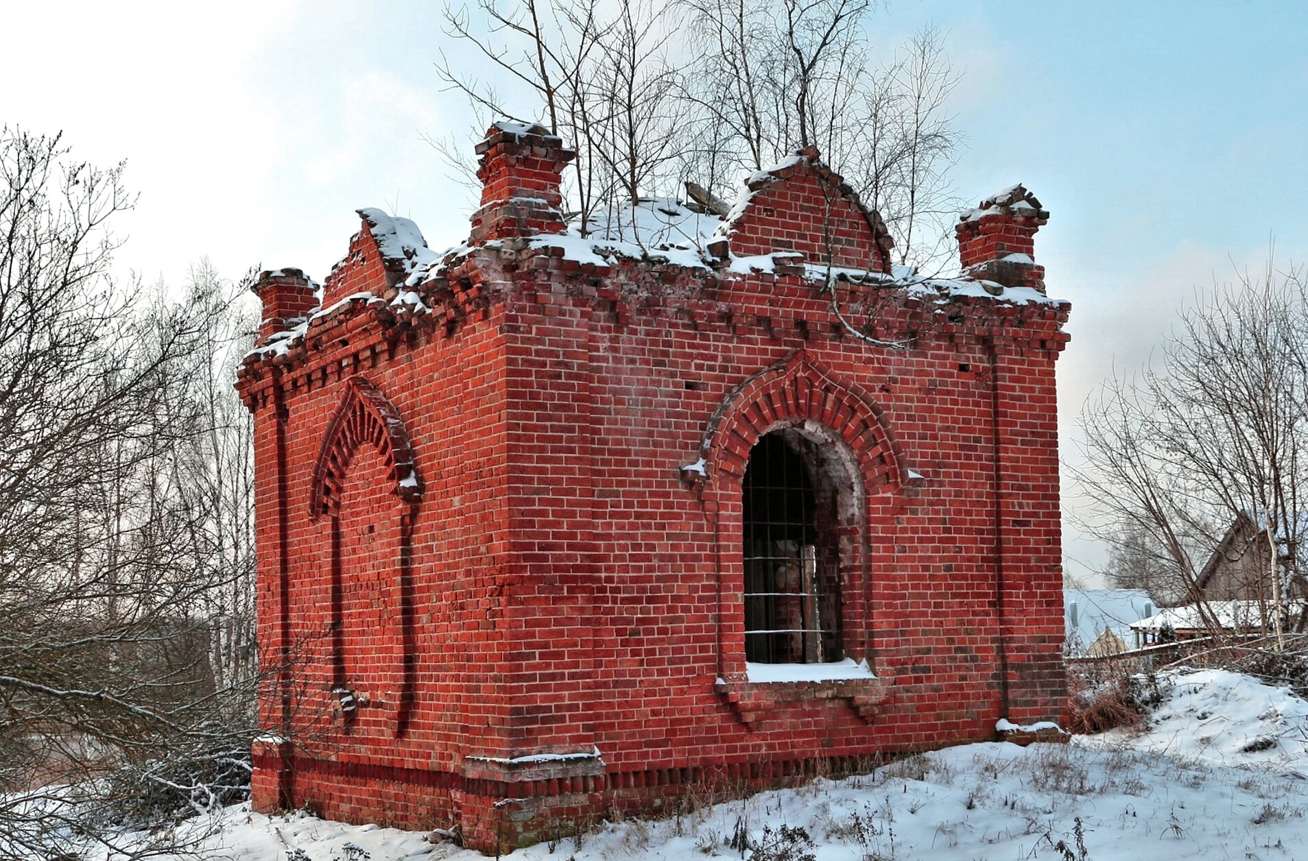 Снимок сделан в зимнее время — крыша и земля вокруг часовни покрыты снежным покровом, а деревья на заднем плане лишены листвы. Такое состояние памятника духовного наследия вызывает особые чувства и напоминает о необходимости сохранения православных святынь русской земли. На заднем плане виднеется часть деревянного строения, характерного для сельской архитектуры центральной России.