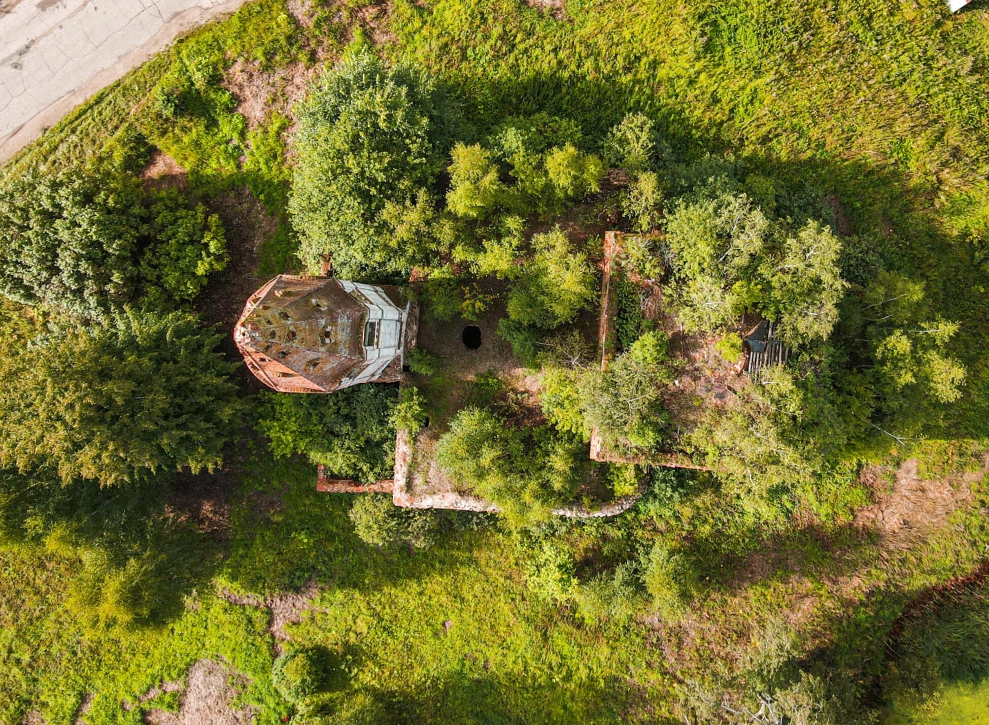 На представленной аэрофотосъемке запечатлена Георгиевская часовня, расположенная в деревне Седельницы Ивановской области. Святыня, освященная в честь великомученика Георгия Победоносца, находится в плачевном состоянии, свидетельствующем о многолетнем забвении.