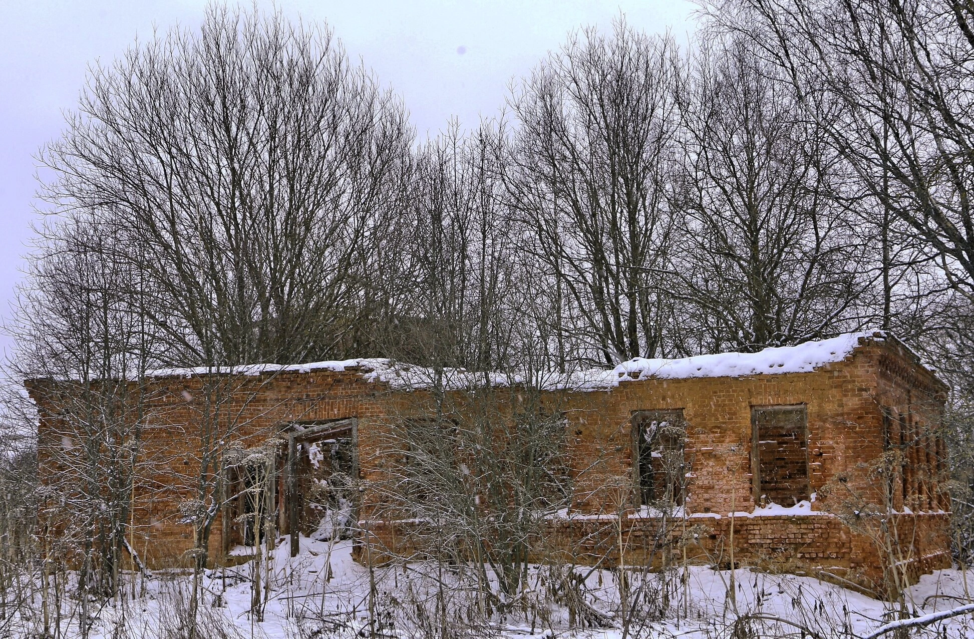 Особую атмосферу скорби усиливает зимнее время, когда был сделан снимок. Снежный покров одевает землю и остатки стен белым саваном, а голые ветви деревьев, проросших сквозь руины, создают ощущение вечного молчания и утраты. Местность вокруг заросла кустарником и молодыми деревьями, что указывает на отсутствие регулярного ухода и поминания.