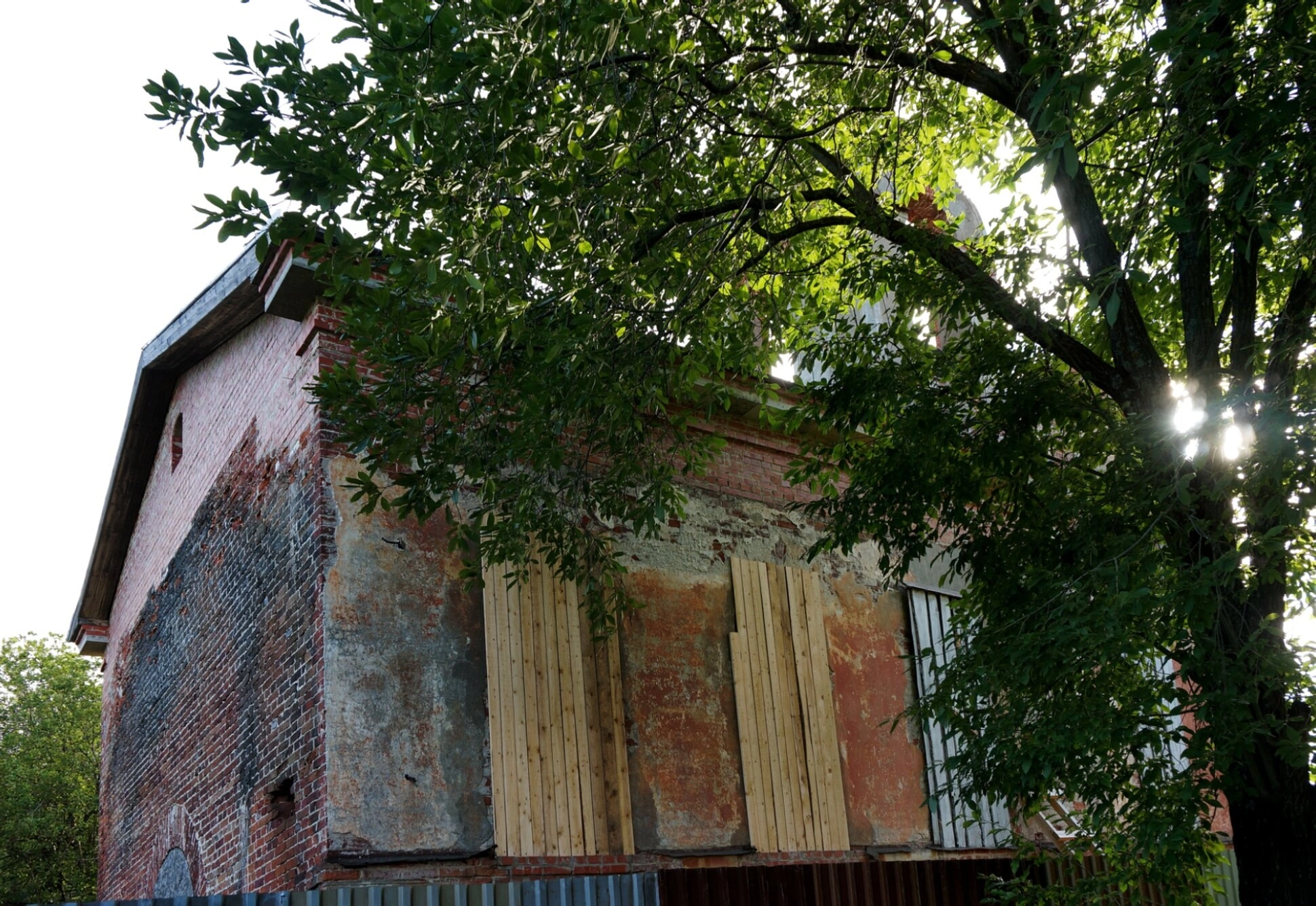 Несмотря на ветхость, здание сохраняет величественный вид и духовную значимость. Справа от храма растёт большое дерево, чья пышная листва символизирует непрерывность жизни и надежду на возрождение святого места. На переднем плане виден металлический забор, ограждающий памятник. Ныне храм, переживший годы богоборчества и neglect, ожидает своего восстановления и возвращения верующим, напоминая о славных страницах русской воинской славы и православной веры.