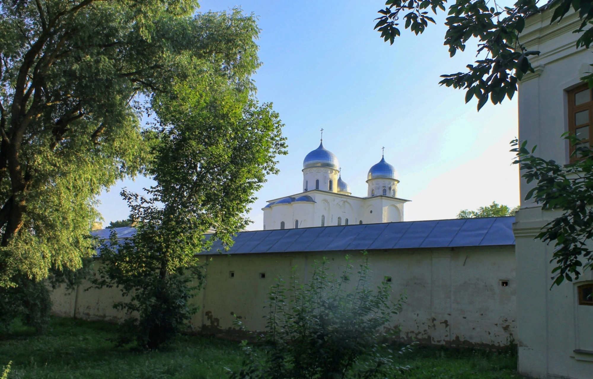 Строгие и лаконичные формы собора, характерные для новгородской архитектурной школы, устремляются ввысь под ясным небом, символизируя молитвенное горение к Господу. Мощные стены, прорезанные узкими оконными проёмами, и величественные главы храма свидетельствуют о его неприступности и духовной силе. На снимке также видны древние монастырские стены и корпуса, окружающие собор, которые создают ощущение замкнутого, благодатного мира, отделённого от суеты.